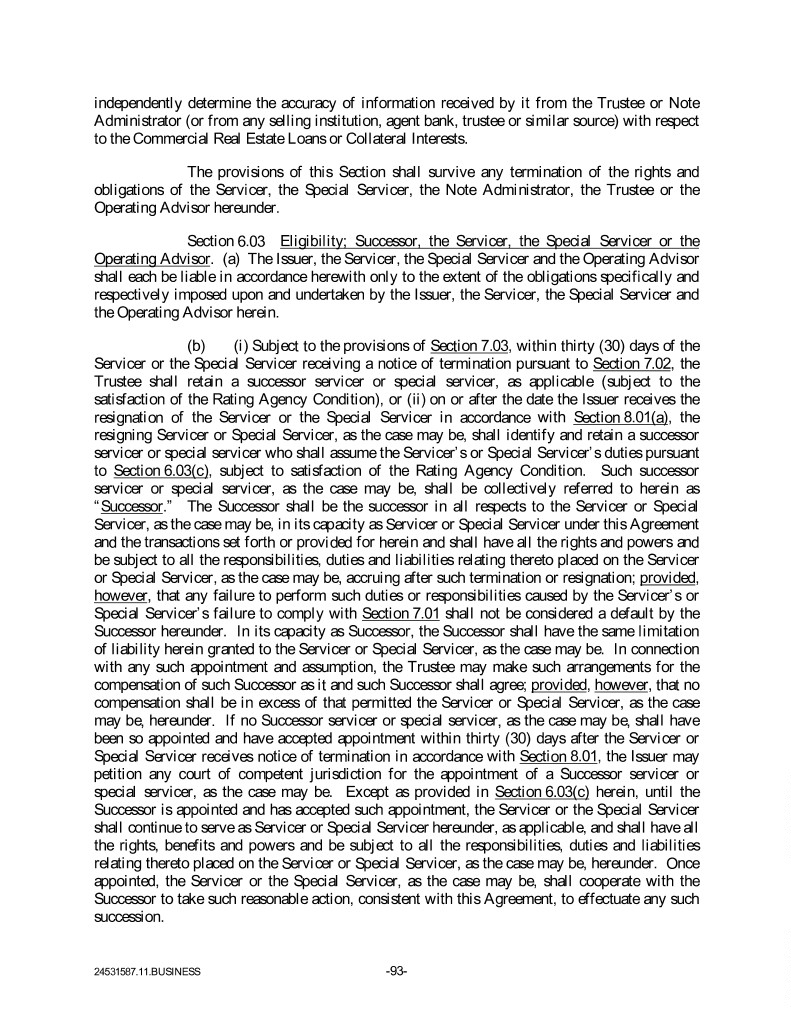 independently determine the accuracy of information received by it from the Trustee or Note Administrator (or from any selling institution, agent bank, trustee or similar source) with respect to the Commercial Real Estate Loans or Collateral Interests. The provisions of this Section shall survive any termination of the rights and obligations of the Servicer, the Special Servicer, the Note Administrator, the Trustee or the Operating Advisor hereunder. Section 6.03 Eligibility; Successor, the Servicer, the Special Servicer or the Operating Advisor. (a) The Issuer, the Servicer, the Special Servicer and the Operating Advisor shall each be liable in accordance herewith only to the extent of the obligations specifically and respectively imposed upon and undertaken by the Issuer, the Servicer, the Special Servicer and the Operating Advisor herein. (b) (i) Subject to the provisions of Section 7.03, within thirty (30) days of the Servicer or the Special Servicer receiving a notice of termination pursuant to Section 7.02, the Trustee shall retain a successor servicer or special servicer, as applicable (subject to the satisfaction of the Rating Agency Condition), or (ii) on or after the date the Issuer receives the resignation of the Servicer or the Special Servicer in accordance with Section 8.01(a), the resigning Servicer or Special Servicer, as the case may be, shall identify and retain a successor servicer or special servicer who shall assume the Servicer’s or Special Servicer’s duties pursuant to Section 6.03(c), subject to satisfaction of the Rating Agency Condition. Such successor servicer or special servicer, as the case may be, shall be collectively referred to herein as “Successor.” The Successor shall be the successor in all respects to the Servicer or Special Servicer, as the case may be, in its capacity as Servicer or Special Servicer under this Agreement and the transactions set forth or provided for herein and shall have all the rights and powers and be subject to all the responsibilities, duties and liabilities relating thereto placed on the Servicer or Special Servicer, as the case may be, accruing after such termination or resignation; provided, however, that any failure to perform such duties or responsibilities caused by the Servicer’s or Special Servicer’s failure to comply with Section 7.01 shall not be considered a default by the Successor hereunder. In its capacity as Successor, the Successor shall have the same limitation of liability herein granted to the Servicer or Special Servicer, as the case may be. In connection with any such appointment and assumption, the Trustee may make such arrangements for the compensation of such Successor as it and such Successor shall agree; provided, however, that no compensation shall be in excess of that permitted the Servicer or Special Servicer, as the case may be, hereunder. If no Successor servicer or special servicer, as the case may be, shall have been so appointed and have accepted appointment within thirty (30) days after the Servicer or Special Servicer receives notice of termination in accordance with Section 8.01, the Issuer may petition any court of competent jurisdiction for the appointment of a Successor servicer or special servicer, as the case may be. Except as provided in Section 6.03(c) herein, until the Successor is appointed and has accepted such appointment, the Servicer or the Special Servicer shall continue to serve as Servicer or Special Servicer hereunder, as applicable, and shall have all the rights, benefits and powers and be subject to all the responsibilities, duties and liabilities relating thereto placed on the Servicer or Special Servicer, as the case may be, hereunder. Once appointed, the Servicer or the Special Servicer, as the case may be, shall cooperate with the Successor to take such reasonable action, consistent with this Agreement, to effectuate any such succession. 24531587.11.BUSINESS -93-