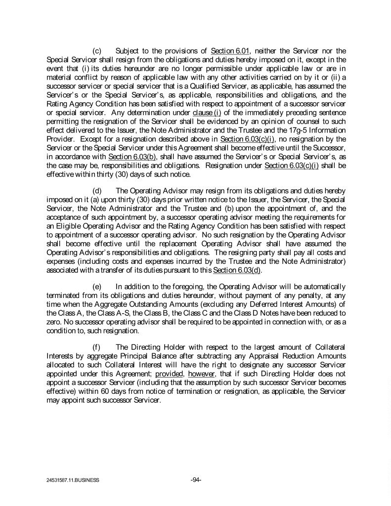 (c) Subject to the provisions of Section 6.01, neither the Servicer nor the Special Servicer shall resign from the obligations and duties hereby imposed on it, except in the event that (i) its duties hereunder are no longer permissible under applicable law or are in material conflict by reason of applicable law with any other activities carried on by it or (ii) a successor servicer or special servicer that is a Qualified Servicer, as applicable, has assumed the Servicer’s or the Special Servicer’s, as applicable, responsibilities and obligations, and the Rating Agency Condition has been satisfied with respect to appointment of a successor servicer or special servicer. Any determination under clause (i) of the immediately preceding sentence permitting the resignation of the Servicer shall be evidenced by an opinion of counsel to such effect delivered to the Issuer, the Note Administrator and the Trustee and the 17g-5 Information Provider. Except for a resignation described above in Section 6.03(c)(i), no resignation by the Servicer or the Special Servicer under this Agreement shall become effective until the Successor, in accordance with Section 6.03(b), shall have assumed the Servicer’s or Special Servicer’s, as the case may be, responsibilities and obligations. Resignation under Section 6.03(c)(i) shall be effective within thirty (30) days of such notice. (d) The Operating Advisor may resign from its obligations and duties hereby imposed on it (a) upon thirty (30) days prior written notice to the Issuer, the Servicer, the Special Servicer, the Note Administrator and the Trustee and (b) upon the appointment of, and the acceptance of such appointment by, a successor operating advisor meeting the requirements for an Eligible Operating Advisor and the Rating Agency Condition has been satisfied with respect to appointment of a successor operating advisor. No such resignation by the Operating Advisor shall become effective until the replacement Operating Advisor shall have assumed the Operating Advisor’s responsibilities and obligations. The resigning party shall pay all costs and expenses (including costs and expenses incurred by the Trustee and the Note Administrator) associated with a transfer of its duties pursuant to this Section 6.03(d). (e) In addition to the foregoing, the Operating Advisor will be automatically terminated from its obligations and duties hereunder, without payment of any penalty, at any time when the Aggregate Outstanding Amounts (excluding any Deferred Interest Amounts) of the Class A, the Class A-S, the Class B, the Class C and the Class D Notes have been reduced to zero. No successor operating advisor shall be required to be appointed in connection with, or as a condition to, such resignation. (f) The Directing Holder with respect to the largest amount of Collateral Interests by aggregate Principal Balance after subtracting any Appraisal Reduction Amounts allocated to such Collateral Interest will have the right to designate any successor Servicer appointed under this Agreement; provided, however, that if such Directing Holder does not appoint a successor Servicer (including that the assumption by such successor Servicer becomes effective) within 60 days from notice of termination or resignation, as applicable, the Servicer may appoint such successor Servicer. 24531587.11.BUSINESS -94-
