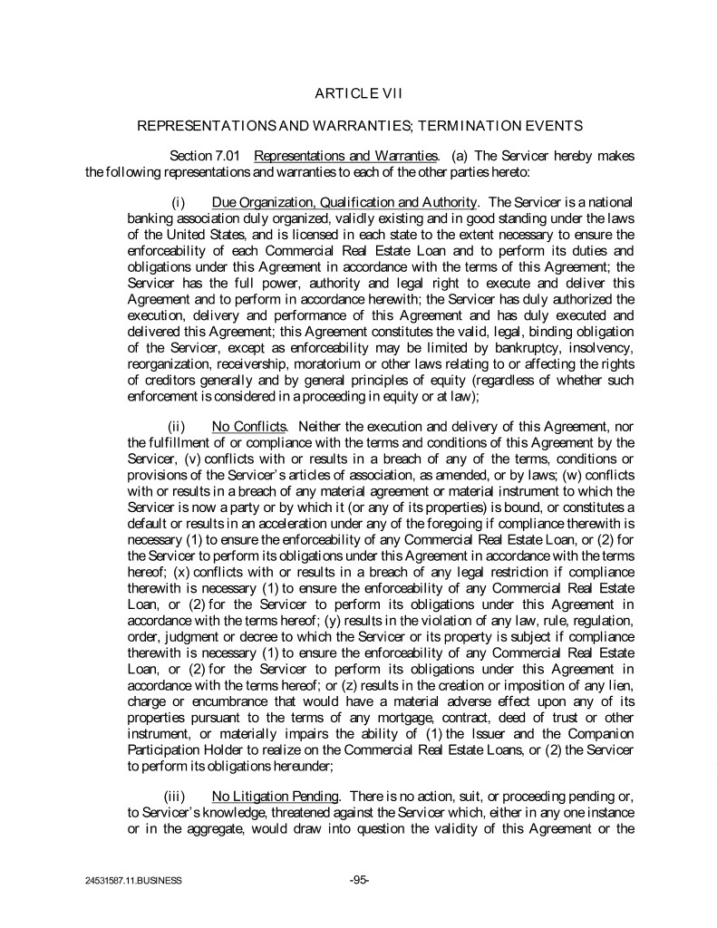 ARTICLE VII REPRESENTATIONS AND WARRANTIES; TERMINATION EVENTS Section 7.01 Representations and Warranties. (a) The Servicer hereby makes the following representations and warranties to each of the other parties hereto: (i) Due Organization, Qualification and Authority. The Servicer is a national banking association duly organized, validly existing and in good standing under the laws of the United States, and is licensed in each state to the extent necessary to ensure the enforceability of each Commercial Real Estate Loan and to perform its duties and obligations under this Agreement in accordance with the terms of this Agreement; the Servicer has the full power, authority and legal right to execute and deliver this Agreement and to perform in accordance herewith; the Servicer has duly authorized the execution, delivery and performance of this Agreement and has duly executed and delivered this Agreement; this Agreement constitutes the valid, legal, binding obligation of the Servicer, except as enforceability may be limited by bankruptcy, insolvency, reorganization, receivership, moratorium or other laws relating to or affecting the rights of creditors generally and by general principles of equity (regardless of whether such enforcement is considered in a proceeding in equity or at law); (ii) No Conflicts. Neither the execution and delivery of this Agreement, nor the fulfillment of or compliance with the terms and conditions of this Agreement by the Servicer, (v) conflicts with or results in a breach of any of the terms, conditions or provisions of the Servicer’s articles of association, as amended, or by laws; (w) conflicts with or results in a breach of any material agreement or material instrument to which the Servicer is now a party or by which it (or any of its properties) is bound, or constitutes a default or results in an acceleration under any of the foregoing if compliance therewith is necessary (1) to ensure the enforceability of any Commercial Real Estate Loan, or (2) for the Servicer to perform its obligations under this Agreement in accordance with the terms hereof; (x) conflicts with or results in a breach of any legal restriction if compliance therewith is necessary (1) to ensure the enforceability of any Commercial Real Estate Loan, or (2) for the Servicer to perform its obligations under this Agreement in accordance with the terms hereof; (y) results in the violation of any law, rule, regulation, order, judgment or decree to which the Servicer or its property is subject if compliance therewith is necessary (1) to ensure the enforceability of any Commercial Real Estate Loan, or (2) for the Servicer to perform its obligations under this Agreement in accordance with the terms hereof; or (z) results in the creation or imposition of any lien, charge or encumbrance that would have a material adverse effect upon any of its properties pursuant to the terms of any mortgage, contract, deed of trust or other instrument, or materially impairs the ability of (1) the Issuer and the Companion Participation Holder to realize on the Commercial Real Estate Loans, or (2) the Servicer to perform its obligations hereunder; (iii) No Litigation Pending. There is no action, suit, or proceeding pending or, to Servicer’s knowledge, threatened against the Servicer which, either in any one instance or in the aggregate, would draw into question the validity of this Agreement or the 24531587.11.BUSINESS -95-
