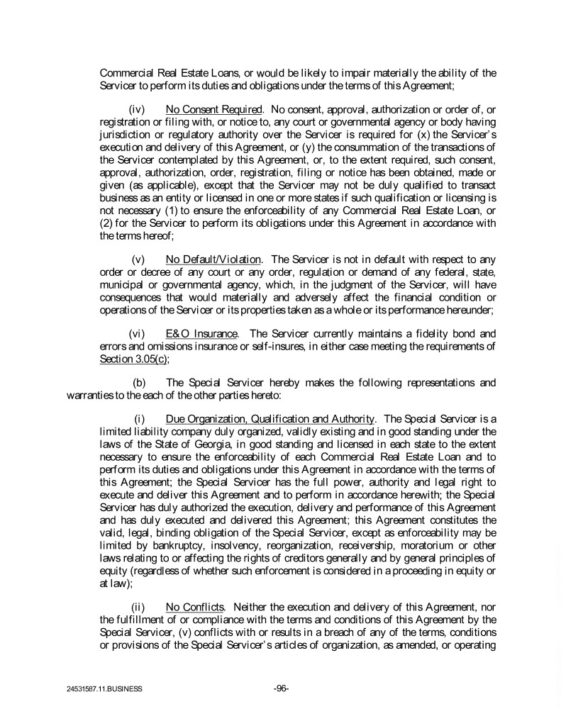 Commercial Real Estate Loans, or would be likely to impair materially the ability of the Servicer to perform its duties and obligations under the terms of this Agreement; (iv) No Consent Required. No consent, approval, authorization or order of, or registration or filing with, or notice to, any court or governmental agency or body having jurisdiction or regulatory authority over the Servicer is required for (x) the Servicer’s execution and delivery of this Agreement, or (y) the consummation of the transactions of the Servicer contemplated by this Agreement, or, to the extent required, such consent, approval, authorization, order, registration, filing or notice has been obtained, made or given (as applicable), except that the Servicer may not be duly qualified to transact business as an entity or licensed in one or more states if such qualification or licensing is not necessary (1) to ensure the enforceability of any Commercial Real Estate Loan, or (2) for the Servicer to perform its obligations under this Agreement in accordance with the terms hereof; (v) No Default/Violation. The Servicer is not in default with respect to any order or decree of any court or any order, regulation or demand of any federal, state, municipal or governmental agency, which, in the judgment of the Servicer, will have consequences that would materially and adversely affect the financial condition or operations of the Servicer or its properties taken as a whole or its performance hereunder; (vi) E&O Insurance. The Servicer currently maintains a fidelity bond and errors and omissions insurance or self-insures, in either case meeting the requirements of Section 3.05(c); (b) The Special Servicer hereby makes the following representations and warranties to the each of the other parties hereto: (i) Due Organization, Qualification and Authority. The Special Servicer is a limited liability company duly organized, validly existing and in good standing under the laws of the State of Georgia, in good standing and licensed in each state to the extent necessary to ensure the enforceability of each Commercial Real Estate Loan and to perform its duties and obligations under this Agreement in accordance with the terms of this Agreement; the Special Servicer has the full power, authority and legal right to execute and deliver this Agreement and to perform in accordance herewith; the Special Servicer has duly authorized the execution, delivery and performance of this Agreement and has duly executed and delivered this Agreement; this Agreement constitutes the valid, legal, binding obligation of the Special Servicer, except as enforceability may be limited by bankruptcy, insolvency, reorganization, receivership, moratorium or other laws relating to or affecting the rights of creditors generally and by general principles of equity (regardless of whether such enforcement is considered in a proceeding in equity or at law); (ii) No Conflicts. Neither the execution and delivery of this Agreement, nor the fulfillment of or compliance with the terms and conditions of this Agreement by the Special Servicer, (v) conflicts with or results in a breach of any of the terms, conditions or provisions of the Special Servicer’s articles of organization, as amended, or operating 24531587.11.BUSINESS -96-