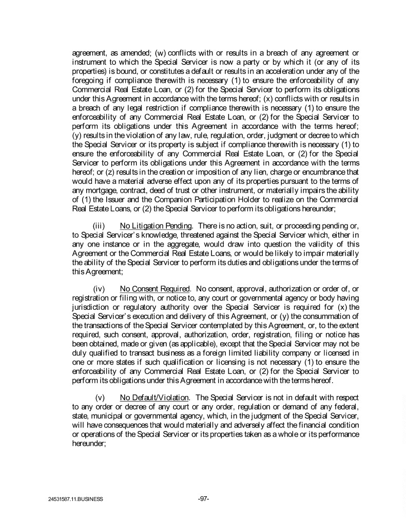 agreement, as amended; (w) conflicts with or results in a breach of any agreement or instrument to which the Special Servicer is now a party or by which it (or any of its properties) is bound, or constitutes a default or results in an acceleration under any of the foregoing if compliance therewith is necessary (1) to ensure the enforceability of any Commercial Real Estate Loan, or (2) for the Special Servicer to perform its obligations under this Agreement in accordance with the terms hereof; (x) conflicts with or results in a breach of any legal restriction if compliance therewith is necessary (1) to ensure the enforceability of any Commercial Real Estate Loan, or (2) for the Special Servicer to perform its obligations under this Agreement in accordance with the terms hereof; (y) results in the violation of any law, rule, regulation, order, judgment or decree to which the Special Servicer or its property is subject if compliance therewith is necessary (1) to ensure the enforceability of any Commercial Real Estate Loan, or (2) for the Special Servicer to perform its obligations under this Agreement in accordance with the terms hereof; or (z) results in the creation or imposition of any lien, charge or encumbrance that would have a material adverse effect upon any of its properties pursuant to the terms of any mortgage, contract, deed of trust or other instrument, or materially impairs the ability of (1) the Issuer and the Companion Participation Holder to realize on the Commercial Real Estate Loans, or (2) the Special Servicer to perform its obligations hereunder; (iii) No Litigation Pending. There is no action, suit, or proceeding pending or, to Special Servicer’s knowledge, threatened against the Special Servicer which, either in any one instance or in the aggregate, would draw into question the validity of this Agreement or the Commercial Real Estate Loans, or would be likely to impair materially the ability of the Special Servicer to perform its duties and obligations under the terms of this Agreement; (iv) No Consent Required. No consent, approval, authorization or order of, or registration or filing with, or notice to, any court or governmental agency or body having jurisdiction or regulatory authority over the Special Servicer is required for (x) the Special Servicer’s execution and delivery of this Agreement, or (y) the consummation of the transactions of the Special Servicer contemplated by this Agreement, or, to the extent required, such consent, approval, authorization, order, registration, filing or notice has been obtained, made or given (as applicable), except that the Special Servicer may not be duly qualified to transact business as a foreign limited liability company or licensed in one or more states if such qualification or licensing is not necessary (1) to ensure the enforceability of any Commercial Real Estate Loan, or (2) for the Special Servicer to perform its obligations under this Agreement in accordance with the terms hereof. (v) No Default/Violation. The Special Servicer is not in default with respect to any order or decree of any court or any order, regulation or demand of any federal, state, municipal or governmental agency, which, in the judgment of the Special Servicer, will have consequences that would materially and adversely affect the financial condition or operations of the Special Servicer or its properties taken as a whole or its performance hereunder; 24531587.11.BUSINESS -97-