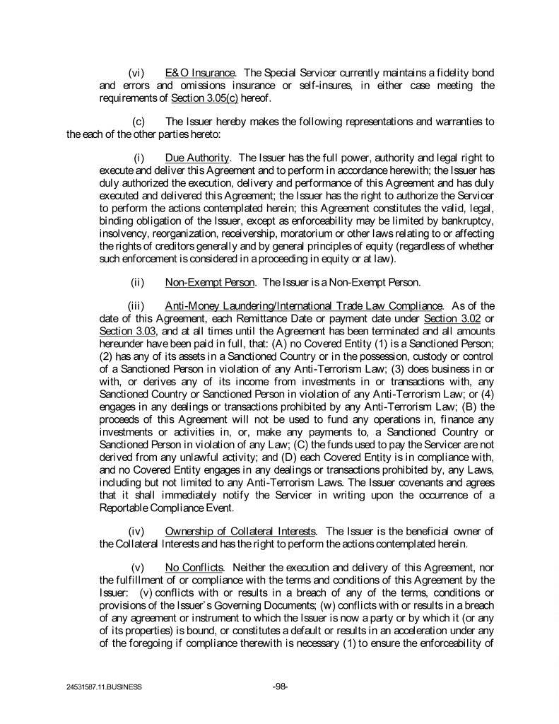 (vi) E&O Insurance. The Special Servicer currently maintains a fidelity bond and errors and omissions insurance or self-insures, in either case meeting the requirements of Section 3.05(c) hereof. (c) The Issuer hereby makes the following representations and warranties to the each of the other parties hereto: (i) Due Authority. The Issuer has the full power, authority and legal right to execute and deliver this Agreement and to perform in accordance herewith; the Issuer has duly authorized the execution, delivery and performance of this Agreement and has duly executed and delivered this Agreement; the Issuer has the right to authorize the Servicer to perform the actions contemplated herein; this Agreement constitutes the valid, legal, binding obligation of the Issuer, except as enforceability may be limited by bankruptcy, insolvency, reorganization, receivership, moratorium or other laws relating to or affecting the rights of creditors generally and by general principles of equity (regardless of whether such enforcement is considered in a proceeding in equity or at law). (ii) Non-Exempt Person. The Issuer is a Non-Exempt Person. (iii) Anti-Money Laundering/International Trade Law Compliance. As of the date of this Agreement, each Remittance Date or payment date under Section 3.02 or Section 3.03, and at all times until the Agreement has been terminated and all amounts hereunder have been paid in full, that: (A) no Covered Entity (1) is a Sanctioned Person; (2) has any of its assets in a Sanctioned Country or in the possession, custody or control of a Sanctioned Person in violation of any Anti-Terrorism Law; (3) does business in or with, or derives any of its income from investments in or transactions with, any Sanctioned Country or Sanctioned Person in violation of any Anti-Terrorism Law; or (4) engages in any dealings or transactions prohibited by any Anti-Terrorism Law; (B) the proceeds of this Agreement will not be used to fund any operations in, finance any investments or activities in, or, make any payments to, a Sanctioned Country or Sanctioned Person in violation of any Law; (C) the funds used to pay the Servicer are not derived from any unlawful activity; and (D) each Covered Entity is in compliance with, and no Covered Entity engages in any dealings or transactions prohibited by, any Laws, including but not limited to any Anti-Terrorism Laws. The Issuer covenants and agrees that it shall immediately notify the Servicer in writing upon the occurrence of a Reportable Compliance Event. (iv) Ownership of Collateral Interests. The Issuer is the beneficial owner of the Collateral Interests and has the right to perform the actions contemplated herein. (v) No Conflicts. Neither the execution and delivery of this Agreement, nor the fulfillment of or compliance with the terms and conditions of this Agreement by the Issuer: (v) conflicts with or results in a breach of any of the terms, conditions or provisions of the Issuer’s Governing Documents; (w) conflicts with or results in a breach of any agreement or instrument to which the Issuer is now a party or by which it (or any of its properties) is bound, or constitutes a default or results in an acceleration under any of the foregoing if compliance therewith is necessary (1) to ensure the enforceability of 24531587.11.BUSINESS -98-