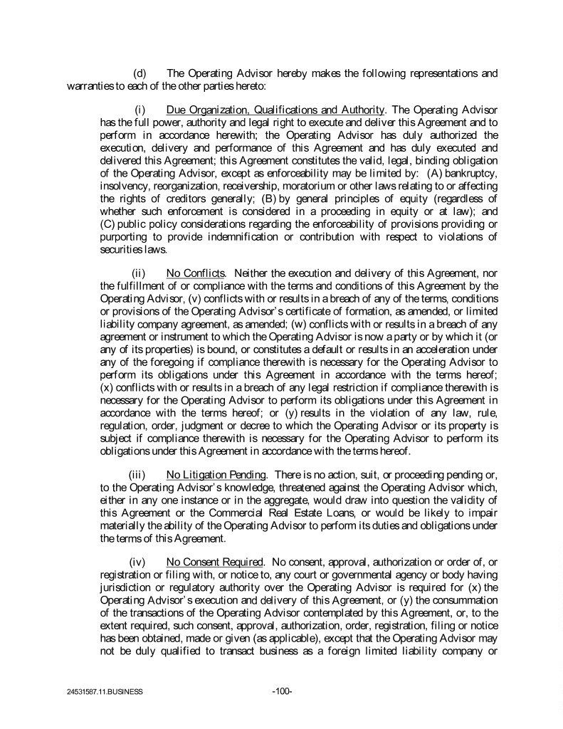 (d) The Operating Advisor hereby makes the following representations and warranties to each of the other parties hereto: (i) Due Organization, Qualifications and Authority. The Operating Advisor has the full power, authority and legal right to execute and deliver this Agreement and to perform in accordance herewith; the Operating Advisor has duly authorized the execution, delivery and performance of this Agreement and has duly executed and delivered this Agreement; this Agreement constitutes the valid, legal, binding obligation of the Operating Advisor, except as enforceability may be limited by: (A) bankruptcy, insolvency, reorganization, receivership, moratorium or other laws relating to or affecting the rights of creditors generally; (B) by general principles of equity (regardless of whether such enforcement is considered in a proceeding in equity or at law); and (C) public policy considerations regarding the enforceability of provisions providing or purporting to provide indemnification or contribution with respect to violations of securities laws. (ii) No Conflicts. Neither the execution and delivery of this Agreement, nor the fulfillment of or compliance with the terms and conditions of this Agreement by the Operating Advisor, (v) conflicts with or results in a breach of any of the terms, conditions or provisions of the Operating Advisor’s certificate of formation, as amended, or limited liability company agreement, as amended; (w) conflicts with or results in a breach of any agreement or instrument to which the Operating Advisor is now a party or by which it (or any of its properties) is bound, or constitutes a default or results in an acceleration under any of the foregoing if compliance therewith is necessary for the Operating Advisor to perform its obligations under this Agreement in accordance with the terms hereof; (x) conflicts with or results in a breach of any legal restriction if compliance therewith is necessary for the Operating Advisor to perform its obligations under this Agreement in accordance with the terms hereof; or (y) results in the violation of any law, rule, regulation, order, judgment or decree to which the Operating Advisor or its property is subject if compliance therewith is necessary for the Operating Advisor to perform its obligations under this Agreement in accordance with the terms hereof. (iii) No Litigation Pending. There is no action, suit, or proceeding pending or, to the Operating Advisor’s knowledge, threatened against the Operating Advisor which, either in any one instance or in the aggregate, would draw into question the validity of this Agreement or the Commercial Real Estate Loans, or would be likely to impair materially the ability of the Operating Advisor to perform its duties and obligations under the terms of this Agreement. (iv) No Consent Required. No consent, approval, authorization or order of, or registration or filing with, or notice to, any court or governmental agency or body having jurisdiction or regulatory authority over the Operating Advisor is required for (x) the Operating Advisor’s execution and delivery of this Agreement, or (y) the consummation of the transactions of the Operating Advisor contemplated by this Agreement, or, to the extent required, such consent, approval, authorization, order, registration, filing or notice has been obtained, made or given (as applicable), except that the Operating Advisor may not be duly qualified to transact business as a foreign limited liability company or 24531587.11.BUSINESS -100-