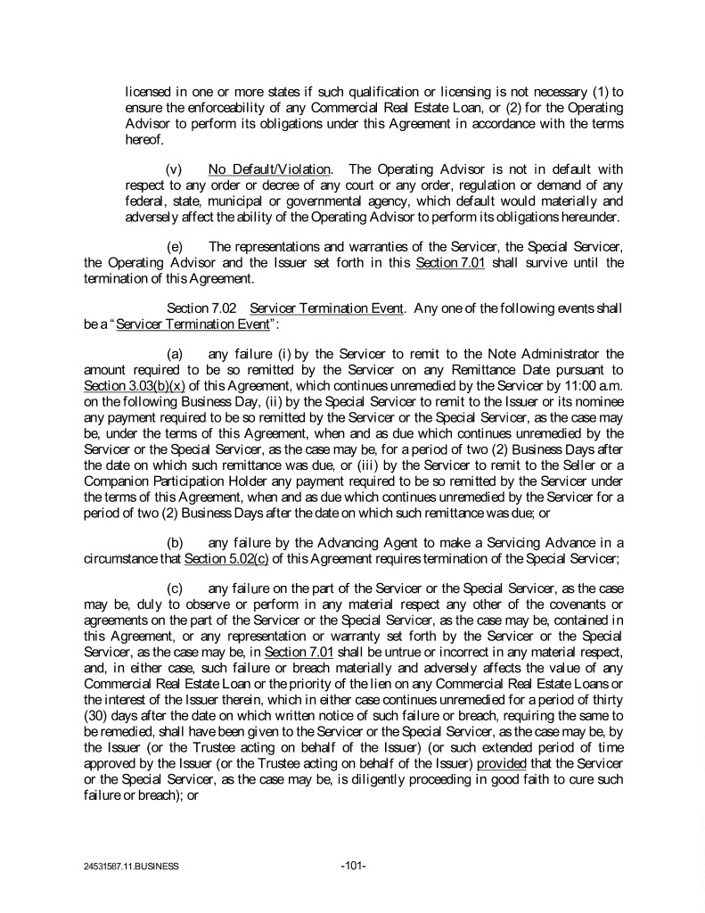 licensed in one or more states if such qualification or licensing is not necessary (1) to ensure the enforceability of any Commercial Real Estate Loan, or (2) for the Operating Advisor to perform its obligations under this Agreement in accordance with the terms hereof. (v) No Default/Violation. The Operating Advisor is not in default with respect to any order or decree of any court or any order, regulation or demand of any federal, state, municipal or governmental agency, which default would materially and adversely affect the ability of the Operating Advisor to perform its obligations hereunder. (e) The representations and warranties of the Servicer, the Special Servicer, the Operating Advisor and the Issuer set forth in this Section 7.01 shall survive until the termination of this Agreement. Section 7.02 Servicer Termination Event. Any one of the following events shall be a “Servicer Termination Event”: (a) any failure (i) by the Servicer to remit to the Note Administrator the amount required to be so remitted by the Servicer on any Remittance Date pursuant to Section 3.03(b)(x) of this Agreement, which continues unremedied by the Servicer by 11:00 a.m. on the following Business Day, (ii) by the Special Servicer to remit to the Issuer or its nominee any payment required to be so remitted by the Servicer or the Special Servicer, as the case may be, under the terms of this Agreement, when and as due which continues unremedied by the Servicer or the Special Servicer, as the case may be, for a period of two (2) Business Days after the date on which such remittance was due, or (iii) by the Servicer to remit to the Seller or a Companion Participation Holder any payment required to be so remitted by the Servicer under the terms of this Agreement, when and as due which continues unremedied by the Servicer for a period of two (2) Business Days after the date on which such remittance was due; or (b) any failure by the Advancing Agent to make a Servicing Advance in a circumstance that Section 5.02(c) of this Agreement requires termination of the Special Servicer; (c) any failure on the part of the Servicer or the Special Servicer, as the case may be, duly to observe or perform in any material respect any other of the covenants or agreements on the part of the Servicer or the Special Servicer, as the case may be, contained in this Agreement, or any representation or warranty set forth by the Servicer or the Special Servicer, as the case may be, in Section 7.01 shall be untrue or incorrect in any material respect, and, in either case, such failure or breach materially and adversely affects the value of any Commercial Real Estate Loan or the priority of the lien on any Commercial Real Estate Loans or the interest of the Issuer therein, which in either case continues unremedied for a period of thirty (30) days after the date on which written notice of such failure or breach, requiring the same to be remedied, shall have been given to the Servicer or the Special Servicer, as the case may be, by the Issuer (or the Trustee acting on behalf of the Issuer) (or such extended period of time approved by the Issuer (or the Trustee acting on behalf of the Issuer) provided that the Servicer or the Special Servicer, as the case may be, is diligently proceeding in good faith to cure such failure or breach); or 24531587.11.BUSINESS -101-