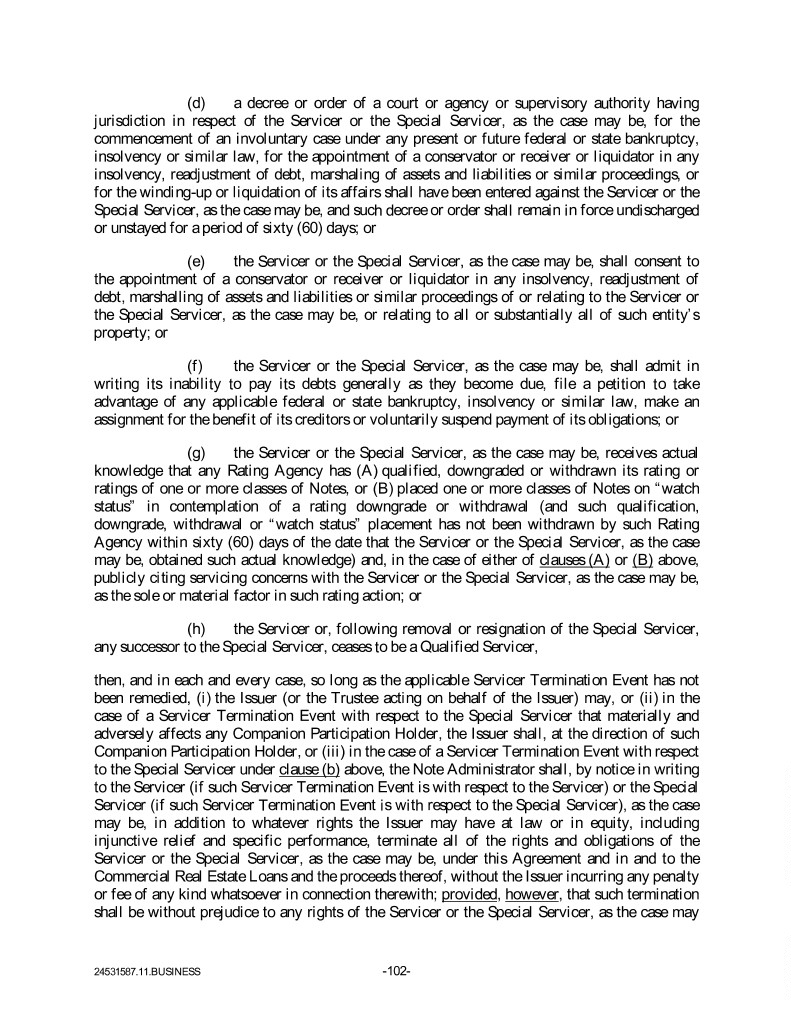 (d) a decree or order of a court or agency or supervisory authority having jurisdiction in respect of the Servicer or the Special Servicer, as the case may be, for the commencement of an involuntary case under any present or future federal or state bankruptcy, insolvency or similar law, for the appointment of a conservator or receiver or liquidator in any insolvency, readjustment of debt, marshaling of assets and liabilities or similar proceedings, or for the winding-up or liquidation of its affairs shall have been entered against the Servicer or the Special Servicer, as the case may be, and such decree or order shall remain in force undischarged or unstayed for a period of sixty (60) days; or (e) the Servicer or the Special Servicer, as the case may be, shall consent to the appointment of a conservator or receiver or liquidator in any insolvency, readjustment of debt, marshalling of assets and liabilities or similar proceedings of or relating to the Servicer or the Special Servicer, as the case may be, or relating to all or substantially all of such entity’s property; or (f) the Servicer or the Special Servicer, as the case may be, shall admit in writing its inability to pay its debts generally as they become due, file a petition to take advantage of any applicable federal or state bankruptcy, insolvency or similar law, make an assignment for the benefit of its creditors or voluntarily suspend payment of its obligations; or (g) the Servicer or the Special Servicer, as the case may be, receives actual knowledge that any Rating Agency has (A) qualified, downgraded or withdrawn its rating or ratings of one or more classes of Notes, or (B) placed one or more classes of Notes on “watch status” in contemplation of a rating downgrade or withdrawal (and such qualification, downgrade, withdrawal or “watch status” placement has not been withdrawn by such Rating Agency within sixty (60) days of the date that the Servicer or the Special Servicer, as the case may be, obtained such actual knowledge) and, in the case of either of clauses (A) or (B) above, publicly citing servicing concerns with the Servicer or the Special Servicer, as the case may be, as the sole or material factor in such rating action; or (h) the Servicer or, following removal or resignation of the Special Servicer, any successor to the Special Servicer, ceases to be a Qualified Servicer, then, and in each and every case, so long as the applicable Servicer Termination Event has not been remedied, (i) the Issuer (or the Trustee acting on behalf of the Issuer) may, or (ii) in the case of a Servicer Termination Event with respect to the Special Servicer that materially and adversely affects any Companion Participation Holder, the Issuer shall, at the direction of such Companion Participation Holder, or (iii) in the case of a Servicer Termination Event with respect to the Special Servicer under clause (b) above, the Note Administrator shall, by notice in writing to the Servicer (if such Servicer Termination Event is with respect to the Servicer) or the Special Servicer (if such Servicer Termination Event is with respect to the Special Servicer), as the case may be, in addition to whatever rights the Issuer may have at law or in equity, including injunctive relief and specific performance, terminate all of the rights and obligations of the Servicer or the Special Servicer, as the case may be, under this Agreement and in and to the Commercial Real Estate Loans and the proceeds thereof, without the Issuer incurring any penalty or fee of any kind whatsoever in connection therewith; provided, however, that such termination shall be without prejudice to any rights of the Servicer or the Special Servicer, as the case may 24531587.11.BUSINESS -102-
