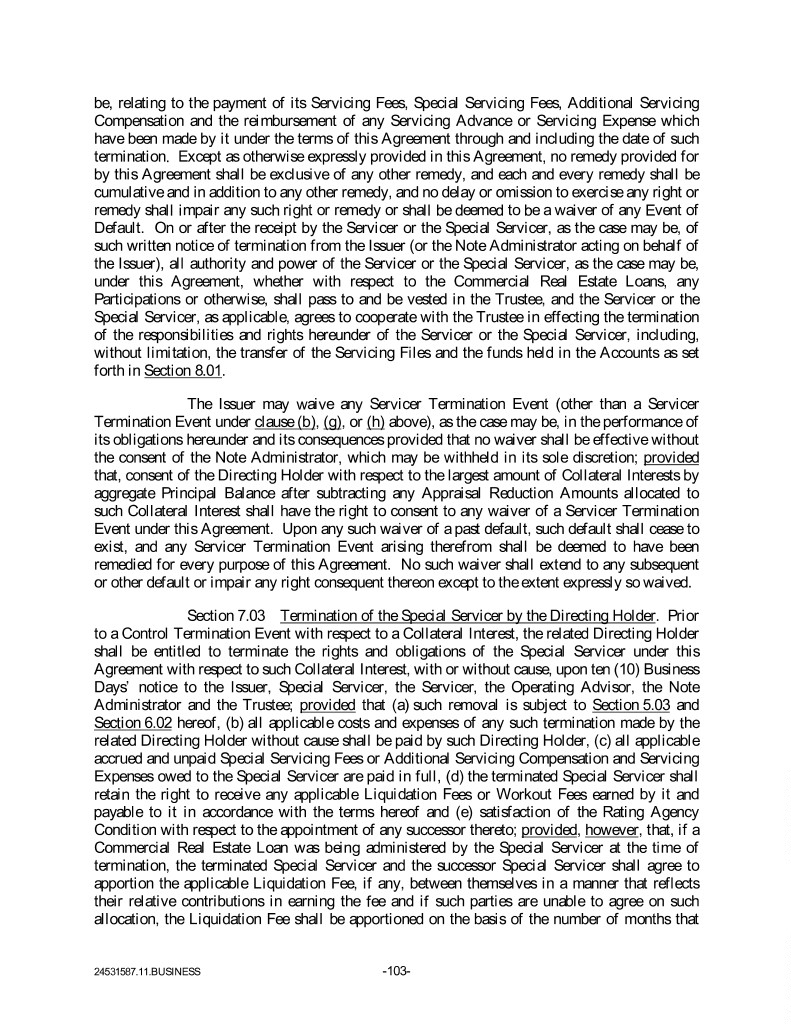 be, relating to the payment of its Servicing Fees, Special Servicing Fees, Additional Servicing Compensation and the reimbursement of any Servicing Advance or Servicing Expense which have been made by it under the terms of this Agreement through and including the date of such termination. Except as otherwise expressly provided in this Agreement, no remedy provided for by this Agreement shall be exclusive of any other remedy, and each and every remedy shall be cumulative and in addition to any other remedy, and no delay or omission to exercise any right or remedy shall impair any such right or remedy or shall be deemed to be a waiver of any Event of Default. On or after the receipt by the Servicer or the Special Servicer, as the case may be, of such written notice of termination from the Issuer (or the Note Administrator acting on behalf of the Issuer), all authority and power of the Servicer or the Special Servicer, as the case may be, under this Agreement, whether with respect to the Commercial Real Estate Loans, any Participations or otherwise, shall pass to and be vested in the Trustee, and the Servicer or the Special Servicer, as applicable, agrees to cooperate with the Trustee in effecting the termination of the responsibilities and rights hereunder of the Servicer or the Special Servicer, including, without limitation, the transfer of the Servicing Files and the funds held in the Accounts as set forth in Section 8.01. The Issuer may waive any Servicer Termination Event (other than a Servicer Termination Event under clause (b), (g), or (h) above), as the case may be, in the performance of its obligations hereunder and its consequences provided that no waiver shall be effective without the consent of the Note Administrator, which may be withheld in its sole discretion; provided that, consent of the Directing Holder with respect to the largest amount of Collateral Interests by aggregate Principal Balance after subtracting any Appraisal Reduction Amounts allocated to such Collateral Interest shall have the right to consent to any waiver of a Servicer Termination Event under this Agreement. Upon any such waiver of a past default, such default shall cease to exist, and any Servicer Termination Event arising therefrom shall be deemed to have been remedied for every purpose of this Agreement. No such waiver shall extend to any subsequent or other default or impair any right consequent thereon except to the extent expressly so waived. Section 7.03 Termination of the Special Servicer by the Directing Holder. Prior to a Control Termination Event with respect to a Collateral Interest, the related Directing Holder shall be entitled to terminate the rights and obligations of the Special Servicer under this Agreement with respect to such Collateral Interest, with or without cause, upon ten (10) Business Days’ notice to the Issuer, Special Servicer, the Servicer, the Operating Advisor, the Note Administrator and the Trustee; provided that (a) such removal is subject to Section 5.03 and Section 6.02 hereof, (b) all applicable costs and expenses of any such termination made by the related Directing Holder without cause shall be paid by such Directing Holder, (c) all applicable accrued and unpaid Special Servicing Fees or Additional Servicing Compensation and Servicing Expenses owed to the Special Servicer are paid in full, (d) the terminated Special Servicer shall retain the right to receive any applicable Liquidation Fees or Workout Fees earned by it and payable to it in accordance with the terms hereof and (e) satisfaction of the Rating Agency Condition with respect to the appointment of any successor thereto; provided, however, that, if a Commercial Real Estate Loan was being administered by the Special Servicer at the time of termination, the terminated Special Servicer and the successor Special Servicer shall agree to apportion the applicable Liquidation Fee, if any, between themselves in a manner that reflects their relative contributions in earning the fee and if such parties are unable to agree on such allocation, the Liquidation Fee shall be apportioned on the basis of the number of months that 24531587.11.BUSINESS -103-