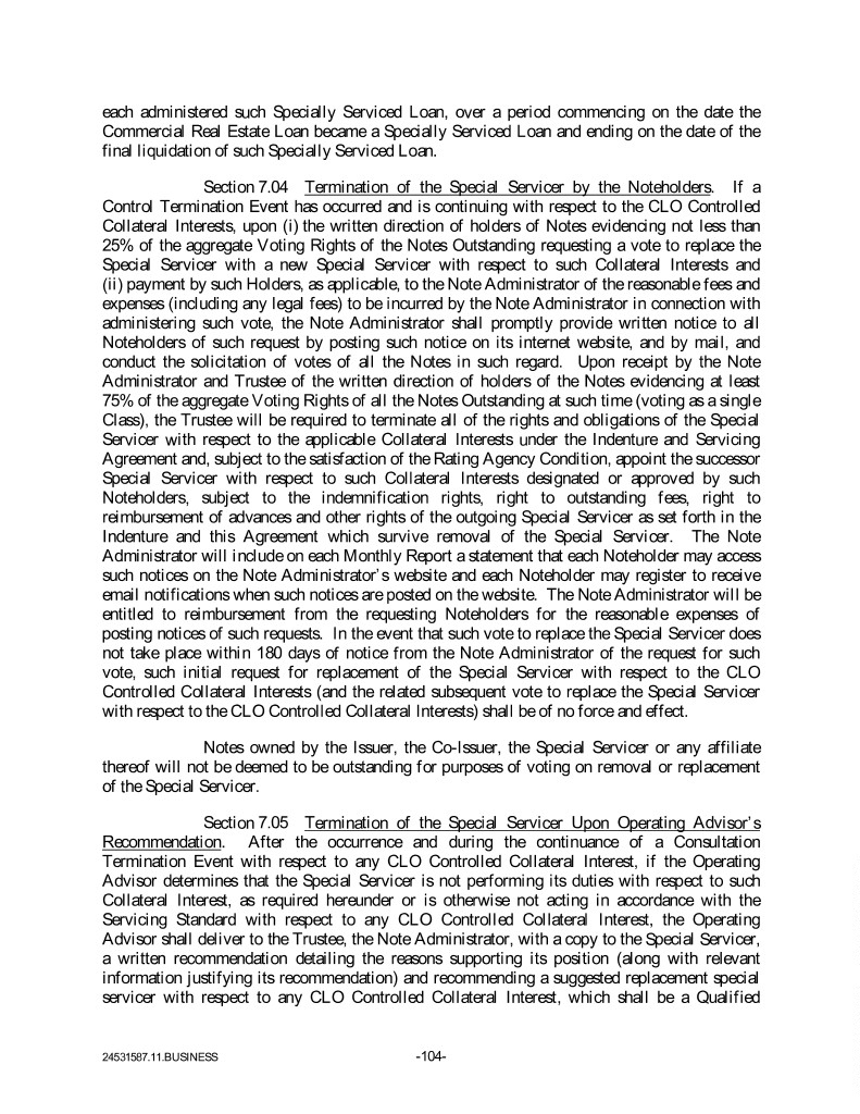 each administered such Specially Serviced Loan, over a period commencing on the date the Commercial Real Estate Loan became a Specially Serviced Loan and ending on the date of the final liquidation of such Specially Serviced Loan. Section 7.04 Termination of the Special Servicer by the Noteholders. If a Control Termination Event has occurred and is continuing with respect to the CLO Controlled Collateral Interests, upon (i) the written direction of holders of Notes evidencing not less than 25% of the aggregate Voting Rights of the Notes Outstanding requesting a vote to replace the Special Servicer with a new Special Servicer with respect to such Collateral Interests and (ii) payment by such Holders, as applicable, to the Note Administrator of the reasonable fees and expenses (including any legal fees) to be incurred by the Note Administrator in connection with administering such vote, the Note Administrator shall promptly provide written notice to all Noteholders of such request by posting such notice on its internet website, and by mail, and conduct the solicitation of votes of all the Notes in such regard. Upon receipt by the Note Administrator and Trustee of the written direction of holders of the Notes evidencing at least 75% of the aggregate Voting Rights of all the Notes Outstanding at such time (voting as a single Class), the Trustee will be required to terminate all of the rights and obligations of the Special Servicer with respect to the applicable Collateral Interests under the Indenture and Servicing Agreement and, subject to the satisfaction of the Rating Agency Condition, appoint the successor Special Servicer with respect to such Collateral Interests designated or approved by such Noteholders, subject to the indemnification rights, right to outstanding fees, right to reimbursement of advances and other rights of the outgoing Special Servicer as set forth in the Indenture and this Agreement which survive removal of the Special Servicer. The Note Administrator will include on each Monthly Report a statement that each Noteholder may access such notices on the Note Administrator’s website and each Noteholder may register to receive email notifications when such notices are posted on the website. The Note Administrator will be entitled to reimbursement from the requesting Noteholders for the reasonable expenses of posting notices of such requests. In the event that such vote to replace the Special Servicer does not take place within 180 days of notice from the Note Administrator of the request for such vote, such initial request for replacement of the Special Servicer with respect to the CLO Controlled Collateral Interests (and the related subsequent vote to replace the Special Servicer with respect to the CLO Controlled Collateral Interests) shall be of no force and effect. Notes owned by the Issuer, the Co-Issuer, the Special Servicer or any affiliate thereof will not be deemed to be outstanding for purposes of voting on removal or replacement of the Special Servicer. Section 7.05 Termination of the Special Servicer Upon Operating Advisor’s Recommendation. After the occurrence and during the continuance of a Consultation Termination Event with respect to any CLO Controlled Collateral Interest, if the Operating Advisor determines that the Special Servicer is not performing its duties with respect to such Collateral Interest, as required hereunder or is otherwise not acting in accordance with the Servicing Standard with respect to any CLO Controlled Collateral Interest, the Operating Advisor shall deliver to the Trustee, the Note Administrator, with a copy to the Special Servicer, a written recommendation detailing the reasons supporting its position (along with relevant information justifying its recommendation) and recommending a suggested replacement special servicer with respect to any CLO Controlled Collateral Interest, which shall be a Qualified 24531587.11.BUSINESS -104-