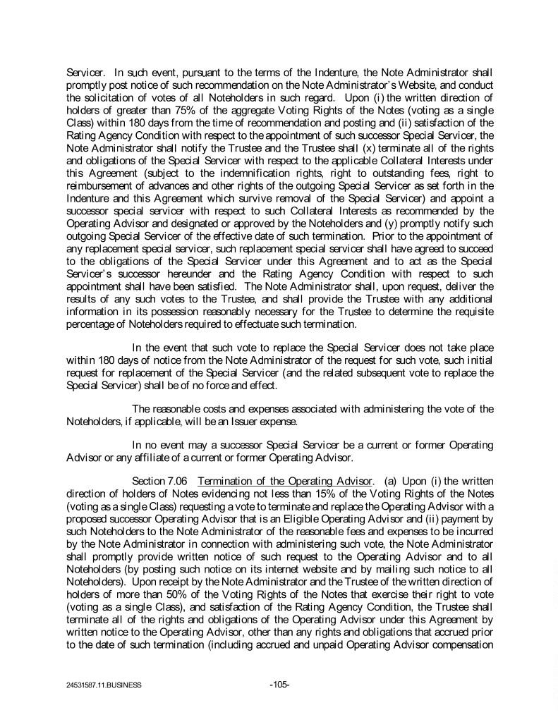 Servicer. In such event, pursuant to the terms of the Indenture, the Note Administrator shall promptly post notice of such recommendation on the Note Administrator’s Website, and conduct the solicitation of votes of all Noteholders in such regard. Upon (i) the written direction of holders of greater than 75% of the aggregate Voting Rights of the Notes (voting as a single Class) within 180 days from the time of recommendation and posting and (ii) satisfaction of the Rating Agency Condition with respect to the appointment of such successor Special Servicer, the Note Administrator shall notify the Trustee and the Trustee shall (x) terminate all of the rights and obligations of the Special Servicer with respect to the applicable Collateral Interests under this Agreement (subject to the indemnification rights, right to outstanding fees, right to reimbursement of advances and other rights of the outgoing Special Servicer as set forth in the Indenture and this Agreement which survive removal of the Special Servicer) and appoint a successor special servicer with respect to such Collateral Interests as recommended by the Operating Advisor and designated or approved by the Noteholders and (y) promptly notify such outgoing Special Servicer of the effective date of such termination. Prior to the appointment of any replacement special servicer, such replacement special servicer shall have agreed to succeed to the obligations of the Special Servicer under this Agreement and to act as the Special Servicer’s successor hereunder and the Rating Agency Condition with respect to such appointment shall have been satisfied. The Note Administrator shall, upon request, deliver the results of any such votes to the Trustee, and shall provide the Trustee with any additional information in its possession reasonably necessary for the Trustee to determine the requisite percentage of Noteholders required to effectuate such termination. In the event that such vote to replace the Special Servicer does not take place within 180 days of notice from the Note Administrator of the request for such vote, such initial request for replacement of the Special Servicer (and the related subsequent vote to replace the Special Servicer) shall be of no force and effect. The reasonable costs and expenses associated with administering the vote of the Noteholders, if applicable, will be an Issuer expense. In no event may a successor Special Servicer be a current or former Operating Advisor or any affiliate of a current or former Operating Advisor. Section 7.06 Termination of the Operating Advisor. (a) Upon (i) the written direction of holders of Notes evidencing not less than 15% of the Voting Rights of the Notes (voting as a single Class) requesting a vote to terminate and replace the Operating Advisor with a proposed successor Operating Advisor that is an Eligible Operating Advisor and (ii) payment by such Noteholders to the Note Administrator of the reasonable fees and expenses to be incurred by the Note Administrator in connection with administering such vote, the Note Administrator shall promptly provide written notice of such request to the Operating Advisor and to all Noteholders (by posting such notice on its internet website and by mailing such notice to all Noteholders). Upon receipt by the Note Administrator and the Trustee of the written direction of holders of more than 50% of the Voting Rights of the Notes that exercise their right to vote (voting as a single Class), and satisfaction of the Rating Agency Condition, the Trustee shall terminate all of the rights and obligations of the Operating Advisor under this Agreement by written notice to the Operating Advisor, other than any rights and obligations that accrued prior to the date of such termination (including accrued and unpaid Operating Advisor compensation 24531587.11.BUSINESS -105-