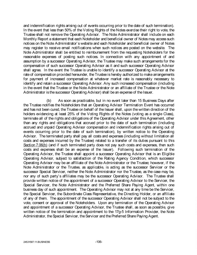 and indemnification rights arising out of events occurring prior to the date of such termination). In the event that less than 50% of the Voting Rights of the Notes exercise their right to vote, the Trustee shall not remove the Operating Advisor. The Note Administrator shall include on each Monthly Report a statement that each Noteholder and beneficial owner of Notes may access such notices on the Note Administrator’s website and each Noteholder and beneficial owner of Notes may register to receive email notifications when such notices are posted on the website. The Note Administrator shall be entitled to reimbursement from the requesting Noteholders for the reasonable expenses of posting such notices. In connection with any appointment of and assumption by a successor Operating Advisor, the Trustee may make such arrangements for the compensation of such successor Operating Advisor as it and such successor Operating Advisor shall agree. In the event the Trustee is unable to identify a successor Operating Advisor at the rate of compensation provided hereunder, the Trustee is hereby authorized to make arrangements for payment of increased compensation at whatever market rate is reasonably necessary to identify and retain a successor Operating Advisor. Any such increased compensation (including in the event that the Trustee or the Note Administrator or an affiliate of the Trustee or the Note Administrator is the successor Operating Advisor) shall be an expense of the Issuer. (b) As soon as practicable, but in no event later than 15 Business Days after the Trustee notifies the Noteholders that an Operating Advisor Termination Event has occurred and has not been cured, the Trustee on behalf of the Issuer shall, upon the written direction of the holders evidencing at least 25% of the Voting Rights of the Notes (voting as a single Class), terminate all of the rights and obligations of the Operating Advisor under this Agreement, other than any rights and obligations that accrued prior to the date of such termination (including accrued and unpaid Operating Advisor compensation and indemnification rights arising out of events occurring prior to the date of such termination), by written notice to the Operating Advisor. The terminated party shall pay all costs and expenses (including without limitation all costs and expenses incurred by the Trustee) related to a transfer of its duties pursuant to this Section 7.06(b) (and if such terminated party does not pay such costs and expenses, then such costs and expenses shall be an expense of the Issuer). Following such termination of the Operating Advisor, the Trustee shall appoint a successor Operating Advisor that is an Eligible Operating Advisor, subject to satisfaction of the Rating Agency Condition, which successor Operating Advisor may be an affiliate of the Note Administrator or the Trustee; however, if the Note Administrator or the Trustee, as applicable, is acting as the successor Servicer or the successor Special Servicer, neither the Note Administrator nor the Trustee, as the case may be, nor any of such party’s affiliates may be the successor Operating Advisor. The Trustee shall provide written notice of the appointment of a successor Operating Advisor to the Servicer, the Special Servicer, the Note Administrator and the Preferred Share Paying Agent, within one business day of such appointment. The Operating Advisor may not at any time be the Servicer, the Special Servicer, the Subordinate Class Representative, the Directing Holder, or an affiliate of any of them. The appointment of the successor Operating Advisor shall not be subject to the vote, consent or approval of the Noteholders. Upon any termination of the Operating Advisor and appointment of a successor Operating Advisor, the Trustee shall, as soon as possible, give written notice of the termination and appointment to the 17g-5 Information Provider, the Note Administrator, the Special Servicer, the Servicer and the Preferred Share Paying Agent. 24531587.11.BUSINESS -106-