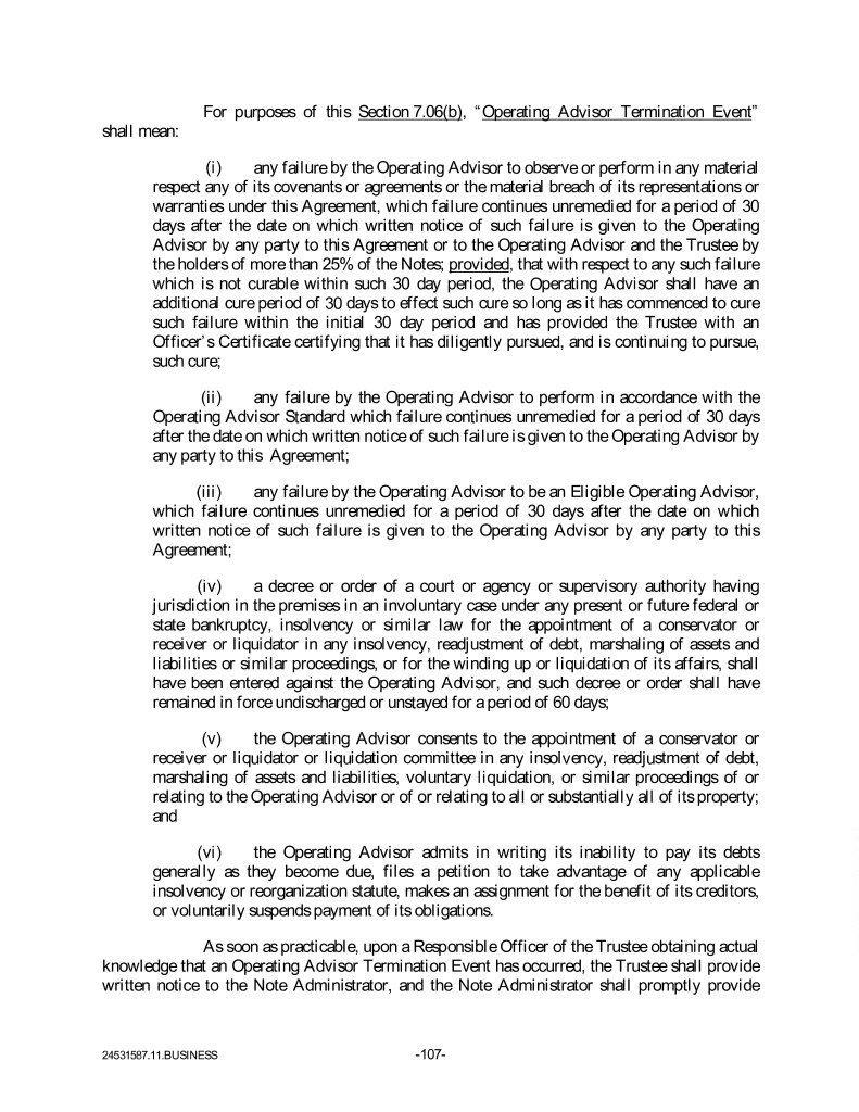 For purposes of this Section 7.06(b), “Operating Advisor Termination Event” shall mean: (i) any failure by the Operating Advisor to observe or perform in any material respect any of its covenants or agreements or the material breach of its representations or warranties under this Agreement, which failure continues unremedied for a period of 30 days after the date on which written notice of such failure is given to the Operating Advisor by any party to this Agreement or to the Operating Advisor and the Trustee by the holders of more than 25% of the Notes; provided, that with respect to any such failure which is not curable within such 30 day period, the Operating Advisor shall have an additional cure period of 30 days to effect such cure so long as it has commenced to cure such failure within the initial 30 day period and has provided the Trustee with an Officer’s Certificate certifying that it has diligently pursued, and is continuing to pursue, such cure; (ii) any failure by the Operating Advisor to perform in accordance with the Operating Advisor Standard which failure continues unremedied for a period of 30 days after the date on which written notice of such failure is given to the Operating Advisor by any party to this Agreement; (iii) any failure by the Operating Advisor to be an Eligible Operating Advisor, which failure continues unremedied for a period of 30 days after the date on which written notice of such failure is given to the Operating Advisor by any party to this Agreement; (iv) a decree or order of a court or agency or supervisory authority having jurisdiction in the premises in an involuntary case under any present or future federal or state bankruptcy, insolvency or similar law for the appointment of a conservator or receiver or liquidator in any insolvency, readjustment of debt, marshaling of assets and liabilities or similar proceedings, or for the winding up or liquidation of its affairs, shall have been entered against the Operating Advisor, and such decree or order shall have remained in force undischarged or unstayed for a period of 60 days; (v) the Operating Advisor consents to the appointment of a conservator or receiver or liquidator or liquidation committee in any insolvency, readjustment of debt, marshaling of assets and liabilities, voluntary liquidation, or similar proceedings of or relating to the Operating Advisor or of or relating to all or substantially all of its property; and (vi) the Operating Advisor admits in writing its inability to pay its debts generally as they become due, files a petition to take advantage of any applicable insolvency or reorganization statute, makes an assignment for the benefit of its creditors, or voluntarily suspends payment of its obligations. As soon as practicable, upon a Responsible Officer of the Trustee obtaining actual knowledge that an Operating Advisor Termination Event has occurred, the Trustee shall provide written notice to the Note Administrator, and the Note Administrator shall promptly provide 24531587.11.BUSINESS -107-