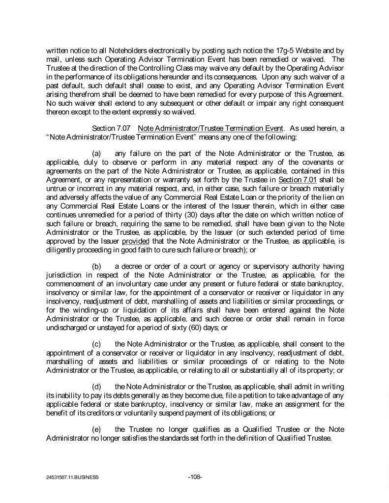 written notice to all Noteholders electronically by posting such notice the 17g-5 Website and by mail, unless such Operating Advisor Termination Event has been remedied or waived. The Trustee at the direction of the Controlling Class may waive any default by the Operating Advisor in the performance of its obligations hereunder and its consequences. Upon any such waiver of a past default, such default shall cease to exist, and any Operating Advisor Termination Event arising therefrom shall be deemed to have been remedied for every purpose of this Agreement. No such waiver shall extend to any subsequent or other default or impair any right consequent thereon except to the extent expressly so waived. Section 7.07 Note Administrator/Trustee Termination Event. As used herein, a “Note Administrator/Trustee Termination Event” means any one of the following: (a) any failure on the part of the Note Administrator or the Trustee, as applicable, duly to observe or perform in any material respect any of the covenants or agreements on the part of the Note Administrator or Trustee, as applicable, contained in this Agreement, or any representation or warranty set forth by the Trustee in Section 7.01 shall be untrue or incorrect in any material respect, and, in either case, such failure or breach materially and adversely affects the value of any Commercial Real Estate Loan or the priority of the lien on any Commercial Real Estate Loans or the interest of the Issuer therein, which in either case continues unremedied for a period of thirty (30) days after the date on which written notice of such failure or breach, requiring the same to be remedied, shall have been given to the Note Administrator or the Trustee, as applicable, by the Issuer (or such extended period of time approved by the Issuer provided that the Note Administrator or the Trustee, as applicable, is diligently proceeding in good faith to cure such failure or breach); or (b) a decree or order of a court or agency or supervisory authority having jurisdiction in respect of the Note Administrator or the Trustee, as applicable, for the commencement of an involuntary case under any present or future federal or state bankruptcy, insolvency or similar law, for the appointment of a conservator or receiver or liquidator in any insolvency, readjustment of debt, marshalling of assets and liabilities or similar proceedings, or for the winding-up or liquidation of its affairs shall have been entered against the Note Administrator or the Trustee, as applicable, and such decree or order shall remain in force undischarged or unstayed for a period of sixty (60) days; or (c) the Note Administrator or the Trustee, as applicable, shall consent to the appointment of a conservator or receiver or liquidator in any insolvency, readjustment of debt, marshalling of assets and liabilities or similar proceedings of or relating to the Note Administrator or the Trustee, as applicable, or relating to all or substantially all of its property; or (d) the Note Administrator or the Trustee, as applicable, shall admit in writing its inability to pay its debts generally as they become due, file a petition to take advantage of any applicable federal or state bankruptcy, insolvency or similar law, make an assignment for the benefit of its creditors or voluntarily suspend payment of its obligations; or (e) the Trustee no longer qualifies as a Qualified Trustee or the Note Administrator no longer satisfies the standards set forth in the definition of Qualified Trustee. 24531587.11.BUSINESS -108-