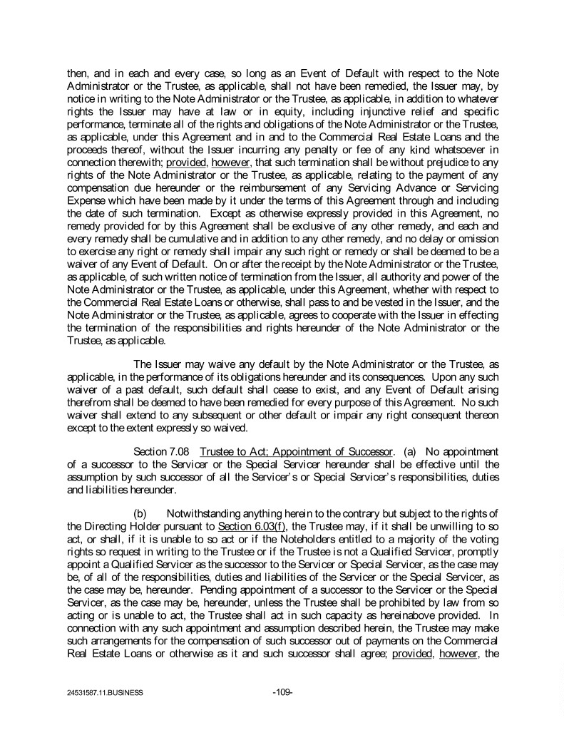 then, and in each and every case, so long as an Event of Default with respect to the Note Administrator or the Trustee, as applicable, shall not have been remedied, the Issuer may, by notice in writing to the Note Administrator or the Trustee, as applicable, in addition to whatever rights the Issuer may have at law or in equity, including injunctive relief and specific performance, terminate all of the rights and obligations of the Note Administrator or the Trustee, as applicable, under this Agreement and in and to the Commercial Real Estate Loans and the proceeds thereof, without the Issuer incurring any penalty or fee of any kind whatsoever in connection therewith; provided, however, that such termination shall be without prejudice to any rights of the Note Administrator or the Trustee, as applicable, relating to the payment of any compensation due hereunder or the reimbursement of any Servicing Advance or Servicing Expense which have been made by it under the terms of this Agreement through and including the date of such termination. Except as otherwise expressly provided in this Agreement, no remedy provided for by this Agreement shall be exclusive of any other remedy, and each and every remedy shall be cumulative and in addition to any other remedy, and no delay or omission to exercise any right or remedy shall impair any such right or remedy or shall be deemed to be a waiver of any Event of Default. On or after the receipt by the Note Administrator or the Trustee, as applicable, of such written notice of termination from the Issuer, all authority and power of the Note Administrator or the Trustee, as applicable, under this Agreement, whether with respect to the Commercial Real Estate Loans or otherwise, shall pass to and be vested in the Issuer, and the Note Administrator or the Trustee, as applicable, agrees to cooperate with the Issuer in effecting the termination of the responsibilities and rights hereunder of the Note Administrator or the Trustee, as applicable. The Issuer may waive any default by the Note Administrator or the Trustee, as applicable, in the performance of its obligations hereunder and its consequences. Upon any such waiver of a past default, such default shall cease to exist, and any Event of Default arising therefrom shall be deemed to have been remedied for every purpose of this Agreement. No such waiver shall extend to any subsequent or other default or impair any right consequent thereon except to the extent expressly so waived. Section 7.08 Trustee to Act; Appointment of Successor. (a) No appointment of a successor to the Servicer or the Special Servicer hereunder shall be effective until the assumption by such successor of all the Servicer’s or Special Servicer’s responsibilities, duties and liabilities hereunder. (b) Notwithstanding anything herein to the contrary but subject to the rights of the Directing Holder pursuant to Section 6.03(f), the Trustee may, if it shall be unwilling to so act, or shall, if it is unable to so act or if the Noteholders entitled to a majority of the voting rights so request in writing to the Trustee or if the Trustee is not a Qualified Servicer, promptly appoint a Qualified Servicer as the successor to the Servicer or Special Servicer, as the case may be, of all of the responsibilities, duties and liabilities of the Servicer or the Special Servicer, as the case may be, hereunder. Pending appointment of a successor to the Servicer or the Special Servicer, as the case may be, hereunder, unless the Trustee shall be prohibited by law from so acting or is unable to act, the Trustee shall act in such capacity as hereinabove provided. In connection with any such appointment and assumption described herein, the Trustee may make such arrangements for the compensation of such successor out of payments on the Commercial Real Estate Loans or otherwise as it and such successor shall agree; provided, however, the 24531587.11.BUSINESS -109-