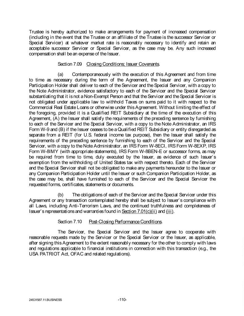 Trustee is hereby authorized to make arrangements for payment of increased compensation (including in the event that the Trustee or an affiliate of the Trustee is the successor Servicer or Special Servicer) at whatever market rate is reasonably necessary to identify and retain an acceptable successor Servicer or Special Servicer, as the case may be. Any such increased compensation shall be an expense of the Issuer. Section 7.09 Closing Conditions; Issuer Covenants. (a) Contemporaneously with the execution of this Agreement and from time to time as necessary during the term of the Agreement, the Issuer and any Companion Participation Holder shall deliver to each of the Servicer and the Special Servicer, with a copy to the Note Administrator, evidence satisfactory to each of the Servicer and the Special Servicer substantiating that it is not a Non-Exempt Person and that the Servicer and the Special Servicer is not obligated under applicable law to withhold Taxes on sums paid to it with respect to the Commercial Real Estate Loans or otherwise under this Agreement. Without limiting the effect of the foregoing, provided it is a Qualified REIT Subsidiary at the time of the execution of this Agreement, (A) the Issuer shall satisfy the requirements of the preceding sentence by furnishing to each of the Servicer and the Special Servicer, with a copy to the Note Administrator, an IRS Form W-9 and (B) if the Issuer ceases to be a Qualified REIT Subsidiary or entity disregarded as separate from a REIT (for U.S. federal income tax purpose), then the Issuer shall satisfy the requirements of the preceding sentence by furnishing to each of the Servicer and the Special Servicer, with a copy to the Note Administrator, an IRS Form W-8ECI, IRS Form W-8EXP, IRS Form W-8IMY (with appropriate statements), IRS Form W-8BEN-E or successor forms, as may be required from time to time, duly executed by the Issuer, as evidence of such Issuer’s exemption from the withholding of United States tax with respect thereto. Each of the Servicer and the Special Servicer shall not be obligated to make any payments hereunder to the Issuer or any Companion Participation Holder until the Issuer or such Companion Participation Holder, as the case may be, shall have furnished to each of the Servicer and the Special Servicer the requested forms, certificates, statements or documents. (b) The obligations of each of the Servicer and the Special Servicer under this Agreement or any transaction contemplated hereby shall be subject to Issuer’s compliance with all Laws, including Anti-Terrorism Laws, and the continued truthfulness and completeness of Issuer’s representations and warranties found in Section 7.01(c)(ii) and (iii). Section 7.10 Post-Closing Performance Conditions. The Servicer, the Special Servicer and the Issuer agree to cooperate with reasonable requests made by the Servicer or the Special Servicer or the Issuer, as applicable, after signing this Agreement to the extent reasonably necessary for the other to comply with laws and regulations applicable to financial institutions in connection with this transaction (e.g., the USA PATRIOT Act, OFAC and related regulations). 24531587.11.BUSINESS -110-