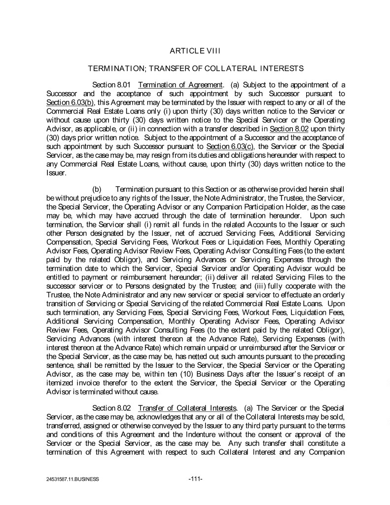 ARTICLE VIII TERMINATION; TRANSFER OF COLLATERAL INTERESTS Section 8.01 Termination of Agreement. (a) Subject to the appointment of a Successor and the acceptance of such appointment by such Successor pursuant to Section 6.03(b), this Agreement may be terminated by the Issuer with respect to any or all of the Commercial Real Estate Loans only (i) upon thirty (30) days written notice to the Servicer or without cause upon thirty (30) days written notice to the Special Servicer or the Operating Advisor, as applicable, or (ii) in connection with a transfer described in Section 8.02 upon thirty (30) days prior written notice. Subject to the appointment of a Successor and the acceptance of such appointment by such Successor pursuant to Section 6.03(c), the Servicer or the Special Servicer, as the case may be, may resign from its duties and obligations hereunder with respect to any Commercial Real Estate Loans, without cause, upon thirty (30) days written notice to the Issuer. (b) Termination pursuant to this Section or as otherwise provided herein shall be without prejudice to any rights of the Issuer, the Note Administrator, the Trustee, the Servicer, the Special Servicer, the Operating Advisor or any Companion Participation Holder, as the case may be, which may have accrued through the date of termination hereunder. Upon such termination, the Servicer shall (i) remit all funds in the related Accounts to the Issuer or such other Person designated by the Issuer, net of accrued Servicing Fees, Additional Servicing Compensation, Special Servicing Fees, Workout Fees or Liquidation Fees, Monthly Operating Advisor Fees, Operating Advisor Review Fees, Operating Advisor Consulting Fees (to the extent paid by the related Obligor), and Servicing Advances or Servicing Expenses through the termination date to which the Servicer, Special Servicer and/or Operating Advisor would be entitled to payment or reimbursement hereunder; (ii) deliver all related Servicing Files to the successor servicer or to Persons designated by the Trustee; and (iii) fully cooperate with the Trustee, the Note Administrator and any new servicer or special servicer to effectuate an orderly transition of Servicing or Special Servicing of the related Commercial Real Estate Loans. Upon such termination, any Servicing Fees, Special Servicing Fees, Workout Fees, Liquidation Fees, Additional Servicing Compensation, Monthly Operating Advisor Fees, Operating Advisor Review Fees, Operating Advisor Consulting Fees (to the extent paid by the related Obligor), Servicing Advances (with interest thereon at the Advance Rate), Servicing Expenses (with interest thereon at the Advance Rate) which remain unpaid or unreimbursed after the Servicer or the Special Servicer, as the case may be, has netted out such amounts pursuant to the preceding sentence, shall be remitted by the Issuer to the Servicer, the Special Servicer or the Operating Advisor, as the case may be, within ten (10) Business Days after the Issuer’s receipt of an itemized invoice therefor to the extent the Servicer, the Special Servicer or the Operating Advisor is terminated without cause. Section 8.02 Transfer of Collateral Interests. (a) The Servicer or the Special Servicer, as the case may be, acknowledges that any or all of the Collateral Interests may be sold, transferred, assigned or otherwise conveyed by the Issuer to any third party pursuant to the terms and conditions of this Agreement and the Indenture without the consent or approval of the Servicer or the Special Servicer, as the case may be. Any such transfer shall constitute a termination of this Agreement with respect to such Collateral Interest and any Companion 24531587.11.BUSINESS -111-