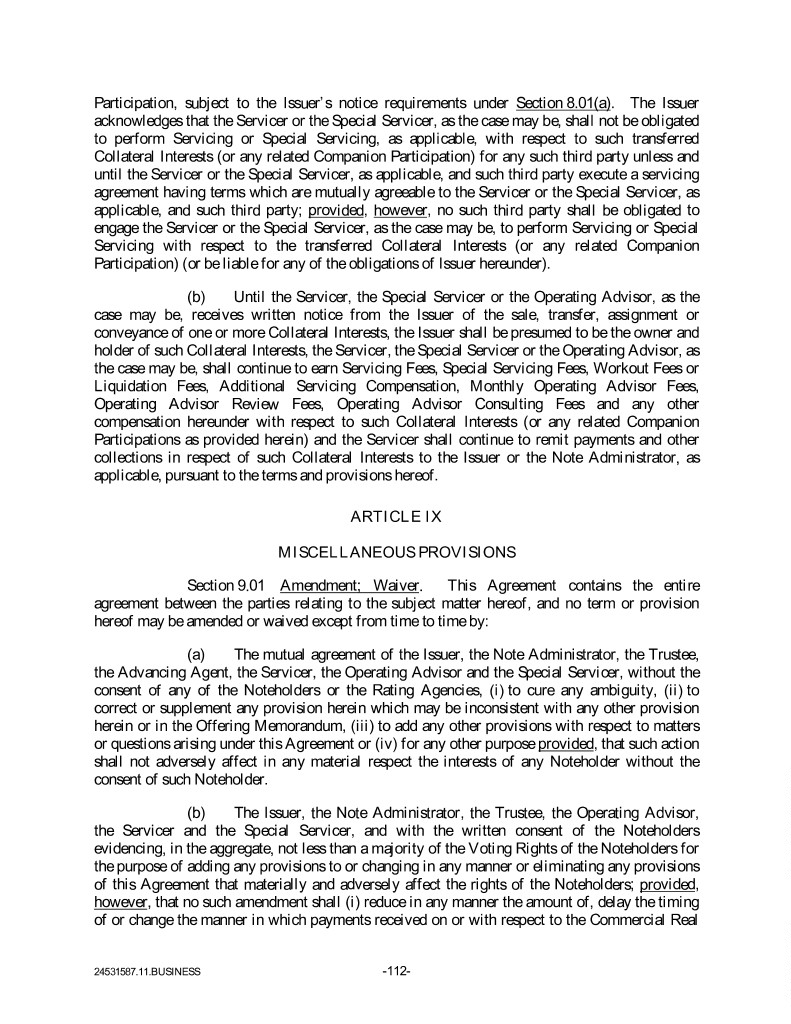Participation, subject to the Issuer’s notice requirements under Section 8.01(a). The Issuer acknowledges that the Servicer or the Special Servicer, as the case may be, shall not be obligated to perform Servicing or Special Servicing, as applicable, with respect to such transferred Collateral Interests (or any related Companion Participation) for any such third party unless and until the Servicer or the Special Servicer, as applicable, and such third party execute a servicing agreement having terms which are mutually agreeable to the Servicer or the Special Servicer, as applicable, and such third party; provided, however, no such third party shall be obligated to engage the Servicer or the Special Servicer, as the case may be, to perform Servicing or Special Servicing with respect to the transferred Collateral Interests (or any related Companion Participation) (or be liable for any of the obligations of Issuer hereunder). (b) Until the Servicer, the Special Servicer or the Operating Advisor, as the case may be, receives written notice from the Issuer of the sale, transfer, assignment or conveyance of one or more Collateral Interests, the Issuer shall be presumed to be the owner and holder of such Collateral Interests, the Servicer, the Special Servicer or the Operating Advisor, as the case may be, shall continue to earn Servicing Fees, Special Servicing Fees, Workout Fees or Liquidation Fees, Additional Servicing Compensation, Monthly Operating Advisor Fees, Operating Advisor Review Fees, Operating Advisor Consulting Fees and any other compensation hereunder with respect to such Collateral Interests (or any related Companion Participations as provided herein) and the Servicer shall continue to remit payments and other collections in respect of such Collateral Interests to the Issuer or the Note Administrator, as applicable, pursuant to the terms and provisions hereof. ARTICLE IX MISCELLANEOUS PROVISIONS Section 9.01 Amendment; Waiver. This Agreement contains the entire agreement between the parties relating to the subject matter hereof, and no term or provision hereof may be amended or waived except from time to time by: (a) The mutual agreement of the Issuer, the Note Administrator, the Trustee, the Advancing Agent, the Servicer, the Operating Advisor and the Special Servicer, without the consent of any of the Noteholders or the Rating Agencies, (i) to cure any ambiguity, (ii) to correct or supplement any provision herein which may be inconsistent with any other provision herein or in the Offering Memorandum, (iii) to add any other provisions with respect to matters or questions arising under this Agreement or (iv) for any other purpose provided, that such action shall not adversely affect in any material respect the interests of any Noteholder without the consent of such Noteholder. (b) The Issuer, the Note Administrator, the Trustee, the Operating Advisor, the Servicer and the Special Servicer, and with the written consent of the Noteholders evidencing, in the aggregate, not less than a majority of the Voting Rights of the Noteholders for the purpose of adding any provisions to or changing in any manner or eliminating any provisions of this Agreement that materially and adversely affect the rights of the Noteholders; provided, however, that no such amendment shall (i) reduce in any manner the amount of, delay the timing of or change the manner in which payments received on or with respect to the Commercial Real 24531587.11.BUSINESS -112-
