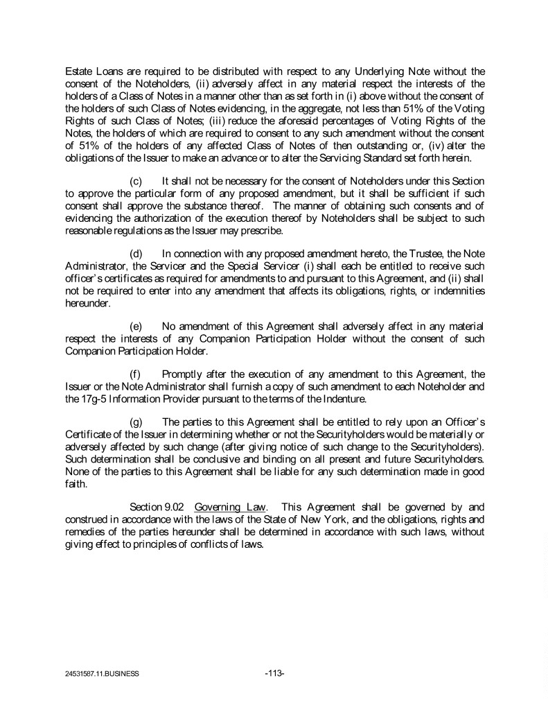 Estate Loans are required to be distributed with respect to any Underlying Note without the consent of the Noteholders, (ii) adversely affect in any material respect the interests of the holders of a Class of Notes in a manner other than as set forth in (i) above without the consent of the holders of such Class of Notes evidencing, in the aggregate, not less than 51% of the Voting Rights of such Class of Notes; (iii) reduce the aforesaid percentages of Voting Rights of the Notes, the holders of which are required to consent to any such amendment without the consent of 51% of the holders of any affected Class of Notes of then outstanding or, (iv) alter the obligations of the Issuer to make an advance or to alter the Servicing Standard set forth herein. (c) It shall not be necessary for the consent of Noteholders under this Section to approve the particular form of any proposed amendment, but it shall be sufficient if such consent shall approve the substance thereof. The manner of obtaining such consents and of evidencing the authorization of the execution thereof by Noteholders shall be subject to such reasonable regulations as the Issuer may prescribe. (d) In connection with any proposed amendment hereto, the Trustee, the Note Administrator, the Servicer and the Special Servicer (i) shall each be entitled to receive such officer’s certificates as required for amendments to and pursuant to this Agreement, and (ii) shall not be required to enter into any amendment that affects its obligations, rights, or indemnities hereunder. (e) No amendment of this Agreement shall adversely affect in any material respect the interests of any Companion Participation Holder without the consent of such Companion Participation Holder. (f) Promptly after the execution of any amendment to this Agreement, the Issuer or the Note Administrator shall furnish a copy of such amendment to each Noteholder and the 17g-5 Information Provider pursuant to the terms of the Indenture. (g) The parties to this Agreement shall be entitled to rely upon an Officer’s Certificate of the Issuer in determining whether or not the Securityholders would be materially or adversely affected by such change (after giving notice of such change to the Securityholders). Such determination shall be conclusive and binding on all present and future Securityholders. None of the parties to this Agreement shall be liable for any such determination made in good faith. Section 9.02 Governing Law. This Agreement shall be governed by and construed in accordance with the laws of the State of New York, and the obligations, rights and remedies of the parties hereunder shall be determined in accordance with such laws, without giving effect to principles of conflicts of laws. 24531587.11.BUSINESS -113-