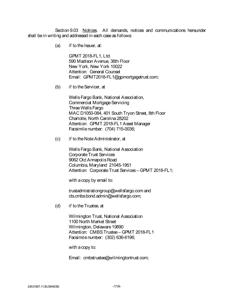 Section 9.03 Notices. All demands, notices and communications hereunder shall be in writing and addressed in each case as follows: (a) if to the Issuer, at: GPMT 2018-FL1, Ltd. 590 Madison Avenue, 38th Floor New York, New York 10022 Attention: General Counsel Email: GPMT2018-FL1@gpmortgagetrust.com; (b) if to the Servicer, at Wells Fargo Bank, National Association, Commercial Mortgage Servicing Three Wells Fargo MAC D1050-084, 401 South Tryon Street, 8th Floor Charlotte, North Carolina 28202 Attention: GPMT 2018-FL1 Asset Manager Facsimile number: (704) 715-0036; (c) if to the Note Administrator, at Wells Fargo Bank, National Association Corporate Trust Services 9062 Old Annapolis Road Columbia, Maryland 21045-1951 Attention: Corporate Trust Services – GPMT 2018-FL1; with a copy by email to: trustadmistrationgroup@wellsfargo.com and cts.cmbs.bond.admin@wellsfargo.com; (d) if to the Trustee, at Wilmington Trust, National Association 1100 North Market Street Wilmington, Delaware 19890 Attention: CMBS Trustee – GPMT 2018-FL1 Facsimile number: (302) 636-6196; with a copy to: Email: cmbstrustee@wilmingtontrust.com; 24531587.11.BUSINESS -114-