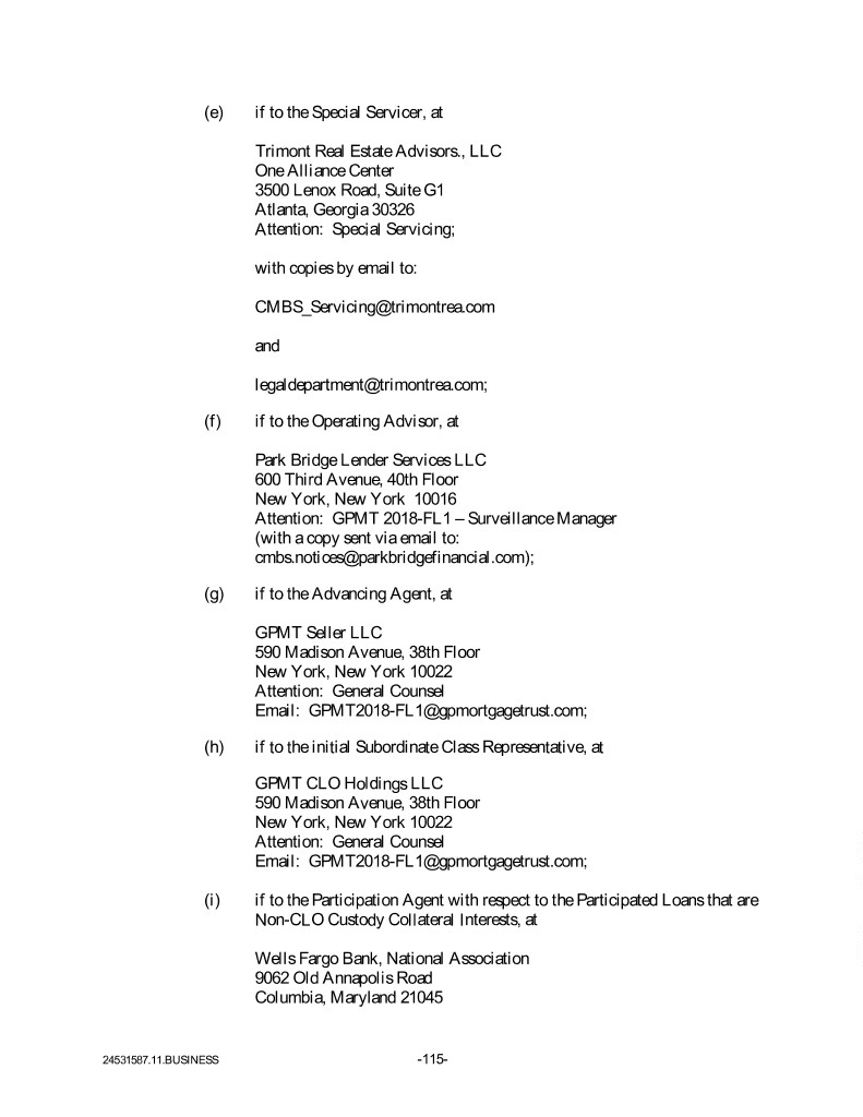 (e) if to the Special Servicer, at Trimont Real Estate Advisors., LLC One Alliance Center 3500 Lenox Road, Suite G1 Atlanta, Georgia 30326 Attention: Special Servicing; with copies by email to: CMBS_Servicing@trimontrea.com and legaldepartment@trimontrea.com; (f) if to the Operating Advisor, at Park Bridge Lender Services LLC 600 Third Avenue, 40th Floor New York, New York 10016 Attention: GPMT 2018-FL1 – Surveillance Manager (with a copy sent via email to: cmbs.notices@parkbridgefinancial.com); (g) if to the Advancing Agent, at GPMT Seller LLC 590 Madison Avenue, 38th Floor New York, New York 10022 Attention: General Counsel Email: GPMT2018-FL1@gpmortgagetrust.com; (h) if to the initial Subordinate Class Representative, at GPMT CLO Holdings LLC 590 Madison Avenue, 38th Floor New York, New York 10022 Attention: General Counsel Email: GPMT2018-FL1@gpmortgagetrust.com; (i) if to the Participation Agent with respect to the Participated Loans that are Non-CLO Custody Collateral Interests, at Wells Fargo Bank, National Association 9062 Old Annapolis Road Columbia, Maryland 21045 24531587.11.BUSINESS -115-
