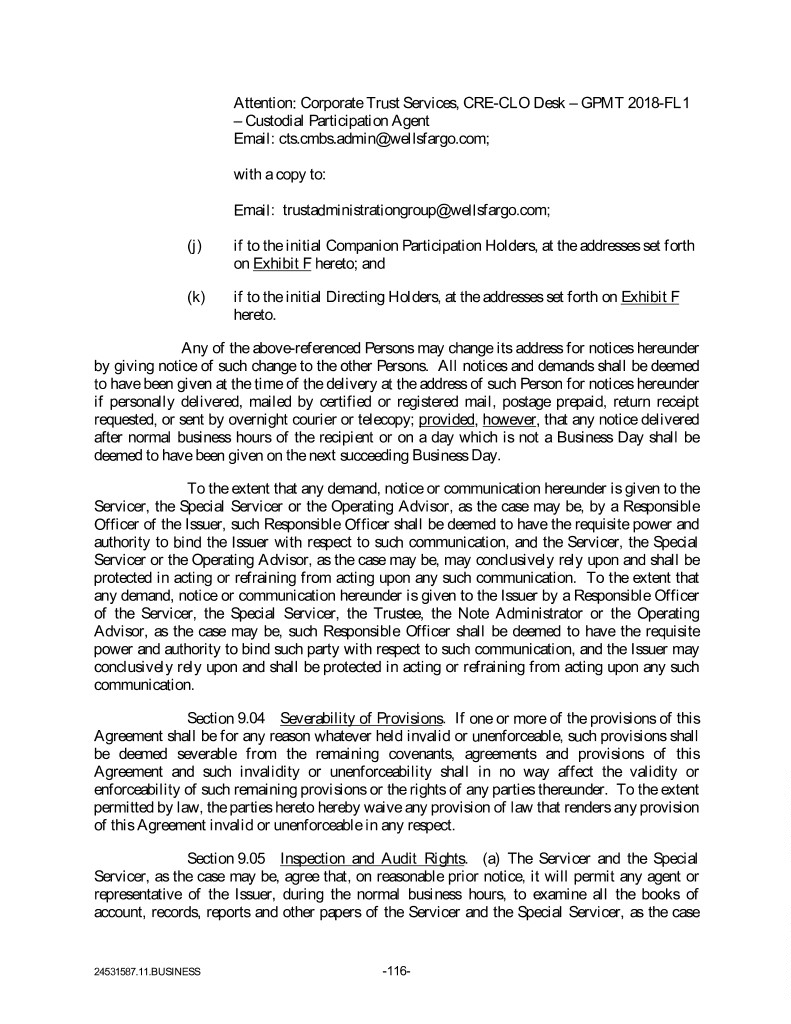 Attention: Corporate Trust Services, CRE-CLO Desk – GPMT 2018-FL1 – Custodial Participation Agent Email: cts.cmbs.admin@wellsfargo.com; with a copy to: Email: trustadministrationgroup@wellsfargo.com; (j) if to the initial Companion Participation Holders, at the addresses set forth on Exhibit F hereto; and (k) if to the initial Directing Holders, at the addresses set forth on Exhibit F hereto. Any of the above-referenced Persons may change its address for notices hereunder by giving notice of such change to the other Persons. All notices and demands shall be deemed to have been given at the time of the delivery at the address of such Person for notices hereunder if personally delivered, mailed by certified or registered mail, postage prepaid, return receipt requested, or sent by overnight courier or telecopy; provided, however, that any notice delivered after normal business hours of the recipient or on a day which is not a Business Day shall be deemed to have been given on the next succeeding Business Day. To the extent that any demand, notice or communication hereunder is given to the Servicer, the Special Servicer or the Operating Advisor, as the case may be, by a Responsible Officer of the Issuer, such Responsible Officer shall be deemed to have the requisite power and authority to bind the Issuer with respect to such communication, and the Servicer, the Special Servicer or the Operating Advisor, as the case may be, may conclusively rely upon and shall be protected in acting or refraining from acting upon any such communication. To the extent that any demand, notice or communication hereunder is given to the Issuer by a Responsible Officer of the Servicer, the Special Servicer, the Trustee, the Note Administrator or the Operating Advisor, as the case may be, such Responsible Officer shall be deemed to have the requisite power and authority to bind such party with respect to such communication, and the Issuer may conclusively rely upon and shall be protected in acting or refraining from acting upon any such communication. Section 9.04 Severability of Provisions. If one or more of the provisions of this Agreement shall be for any reason whatever held invalid or unenforceable, such provisions shall be deemed severable from the remaining covenants, agreements and provisions of this Agreement and such invalidity or unenforceability shall in no way affect the validity or enforceability of such remaining provisions or the rights of any parties thereunder. To the extent permitted by law, the parties hereto hereby waive any provision of law that renders any provision of this Agreement invalid or unenforceable in any respect. Section 9.05 Inspection and Audit Rights. (a) The Servicer and the Special Servicer, as the case may be, agree that, on reasonable prior notice, it will permit any agent or representative of the Issuer, during the normal business hours, to examine all the books of account, records, reports and other papers of the Servicer and the Special Servicer, as the case 24531587.11.BUSINESS -116-