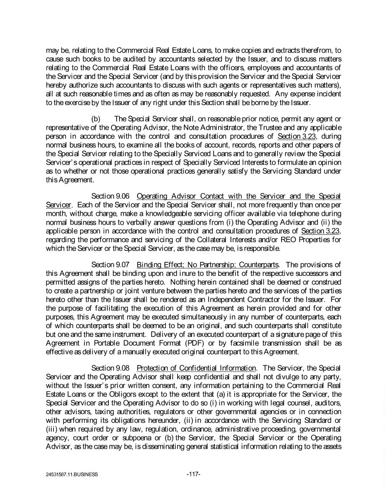 may be, relating to the Commercial Real Estate Loans, to make copies and extracts therefrom, to cause such books to be audited by accountants selected by the Issuer, and to discuss matters relating to the Commercial Real Estate Loans with the officers, employees and accountants of the Servicer and the Special Servicer (and by this provision the Servicer and the Special Servicer hereby authorize such accountants to discuss with such agents or representatives such matters), all at such reasonable times and as often as may be reasonably requested. Any expense incident to the exercise by the Issuer of any right under this Section shall be borne by the Issuer. (b) The Special Servicer shall, on reasonable prior notice, permit any agent or representative of the Operating Advisor, the Note Administrator, the Trustee and any applicable person in accordance with the control and consultation procedures of Section 3.23, during normal business hours, to examine all the books of account, records, reports and other papers of the Special Servicer relating to the Specially Serviced Loans and to generally review the Special Servicer’s operational practices in respect of Specially Serviced Interests to formulate an opinion as to whether or not those operational practices generally satisfy the Servicing Standard under this Agreement. Section 9.06 Operating Advisor Contact with the Servicer and the Special Servicer. Each of the Servicer and the Special Servicer shall, not more frequently than once per month, without charge, make a knowledgeable servicing officer available via telephone during normal business hours to verbally answer questions from (i) the Operating Advisor and (ii) the applicable person in accordance with the control and consultation procedures of Section 3.23, regarding the performance and servicing of the Collateral Interests and/or REO Properties for which the Servicer or the Special Servicer, as the case may be, is responsible. Section 9.07 Binding Effect; No Partnership; Counterparts. The provisions of this Agreement shall be binding upon and inure to the benefit of the respective successors and permitted assigns of the parties hereto. Nothing herein contained shall be deemed or construed to create a partnership or joint venture between the parties hereto and the services of the parties hereto other than the Issuer shall be rendered as an Independent Contractor for the Issuer. For the purpose of facilitating the execution of this Agreement as herein provided and for other purposes, this Agreement may be executed simultaneously in any number of counterparts, each of which counterparts shall be deemed to be an original, and such counterparts shall constitute but one and the same instrument. Delivery of an executed counterpart of a signature page of this Agreement in Portable Document Format (PDF) or by facsimile transmission shall be as effective as delivery of a manually executed original counterpart to this Agreement. Section 9.08 Protection of Confidential Information. The Servicer, the Special Servicer and the Operating Advisor shall keep confidential and shall not divulge to any party, without the Issuer’s prior written consent, any information pertaining to the Commercial Real Estate Loans or the Obligors except to the extent that (a) it is appropriate for the Servicer, the Special Servicer and the Operating Advisor to do so (i) in working with legal counsel, auditors, other advisors, taxing authorities, regulators or other governmental agencies or in connection with performing its obligations hereunder, (ii) in accordance with the Servicing Standard or (iii) when required by any law, regulation, ordinance, administrative proceeding, governmental agency, court order or subpoena or (b) the Servicer, the Special Servicer or the Operating Advisor, as the case may be, is disseminating general statistical information relating to the assets 24531587.11.BUSINESS -117-