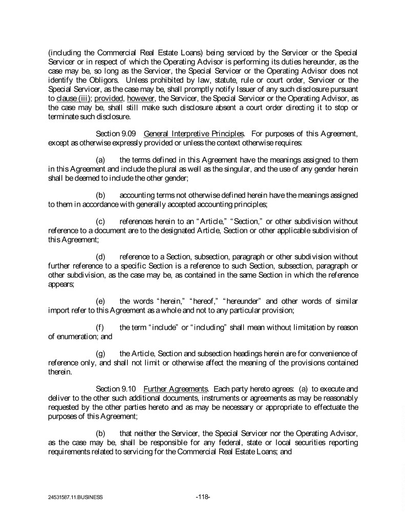 (including the Commercial Real Estate Loans) being serviced by the Servicer or the Special Servicer or in respect of which the Operating Advisor is performing its duties hereunder, as the case may be, so long as the Servicer, the Special Servicer or the Operating Advisor does not identify the Obligors. Unless prohibited by law, statute, rule or court order, Servicer or the Special Servicer, as the case may be, shall promptly notify Issuer of any such disclosure pursuant to clause (iii); provided, however, the Servicer, the Special Servicer or the Operating Advisor, as the case may be, shall still make such disclosure absent a court order directing it to stop or terminate such disclosure. Section 9.09 General Interpretive Principles. For purposes of this Agreement, except as otherwise expressly provided or unless the context otherwise requires: (a) the terms defined in this Agreement have the meanings assigned to them in this Agreement and include the plural as well as the singular, and the use of any gender herein shall be deemed to include the other gender; (b) accounting terms not otherwise defined herein have the meanings assigned to them in accordance with generally accepted accounting principles; (c) references herein to an “Article,” “Section,” or other subdivision without reference to a document are to the designated Article, Section or other applicable subdivision of this Agreement; (d) reference to a Section, subsection, paragraph or other subdivision without further reference to a specific Section is a reference to such Section, subsection, paragraph or other subdivision, as the case may be, as contained in the same Section in which the reference appears; (e) the words “herein,” “hereof,” “hereunder” and other words of similar import refer to this Agreement as a whole and not to any particular provision; (f) the term “include” or “including” shall mean without limitation by reason of enumeration; and (g) the Article, Section and subsection headings herein are for convenience of reference only, and shall not limit or otherwise affect the meaning of the provisions contained therein. Section 9.10 Further Agreements. Each party hereto agrees: (a) to execute and deliver to the other such additional documents, instruments or agreements as may be reasonably requested by the other parties hereto and as may be necessary or appropriate to effectuate the purposes of this Agreement; (b) that neither the Servicer, the Special Servicer nor the Operating Advisor, as the case may be, shall be responsible for any federal, state or local securities reporting requirements related to servicing for the Commercial Real Estate Loans; and 24531587.11.BUSINESS -118-