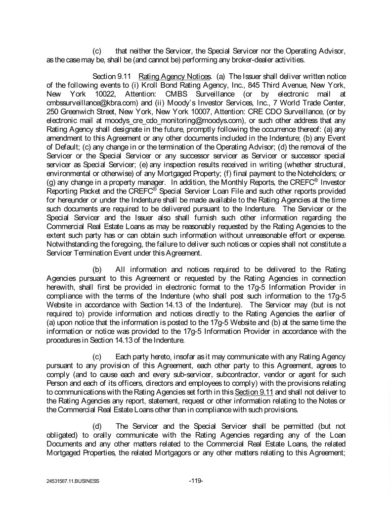 (c) that neither the Servicer, the Special Servicer nor the Operating Advisor, as the case may be, shall be (and cannot be) performing any broker-dealer activities. Section 9.11 Rating Agency Notices. (a) The Issuer shall deliver written notice of the following events to (i) Kroll Bond Rating Agency, Inc., 845 Third Avenue, New York, New York 10022, Attention: CMBS Surveillance (or by electronic mail at cmbssurveillance@kbra.com) and (ii) Moody’s Investor Services, Inc., 7 World Trade Center, 250 Greenwich Street, New York, New York 10007, Attention: CRE CDO Surveillance, (or by electronic mail at moodys_cre_cdo_monitoring@moodys.com), or such other address that any Rating Agency shall designate in the future, promptly following the occurrence thereof: (a) any amendment to this Agreement or any other documents included in the Indenture; (b) any Event of Default; (c) any change in or the termination of the Operating Advisor; (d) the removal of the Servicer or the Special Servicer or any successor servicer as Servicer or successor special servicer as Special Servicer; (e) any inspection results received in writing (whether structural, environmental or otherwise) of any Mortgaged Property; (f) final payment to the Noteholders; or (g) any change in a property manager. In addition, the Monthly Reports, the CREFC® Investor Reporting Packet and the CREFC® Special Servicer Loan File and such other reports provided for hereunder or under the Indenture shall be made available to the Rating Agencies at the time such documents are required to be delivered pursuant to the Indenture. The Servicer or the Special Servicer and the Issuer also shall furnish such other information regarding the Commercial Real Estate Loans as may be reasonably requested by the Rating Agencies to the extent such party has or can obtain such information without unreasonable effort or expense. Notwithstanding the foregoing, the failure to deliver such notices or copies shall not constitute a Servicer Termination Event under this Agreement. (b) All information and notices required to be delivered to the Rating Agencies pursuant to this Agreement or requested by the Rating Agencies in connection herewith, shall first be provided in electronic format to the 17g-5 Information Provider in compliance with the terms of the Indenture (who shall post such information to the 17g-5 Website in accordance with Section 14.13 of the Indenture). The Servicer may (but is not required to) provide information and notices directly to the Rating Agencies the earlier of (a) upon notice that the information is posted to the 17g-5 Website and (b) at the same time the information or notice was provided to the 17g-5 Information Provider in accordance with the procedures in Section 14.13 of the Indenture. (c) Each party hereto, insofar as it may communicate with any Rating Agency pursuant to any provision of this Agreement, each other party to this Agreement, agrees to comply (and to cause each and every sub-servicer, subcontractor, vendor or agent for such Person and each of its officers, directors and employees to comply) with the provisions relating to communications with the Rating Agencies set forth in this Section 9.11 and shall not deliver to the Rating Agencies any report, statement, request or other information relating to the Notes or the Commercial Real Estate Loans other than in compliance with such provisions. (d) The Servicer and the Special Servicer shall be permitted (but not obligated) to orally communicate with the Rating Agencies regarding any of the Loan Documents and any other matters related to the Commercial Real Estate Loans, the related Mortgaged Properties, the related Mortgagors or any other matters relating to this Agreement; 24531587.11.BUSINESS -119-