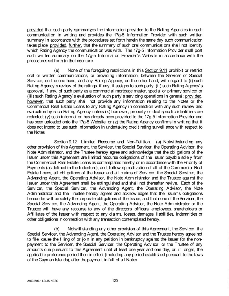 provided that such party summarizes the information provided to the Rating Agencies in such communication in writing and provides the 17g-5 Information Provider with such written summary in accordance with the procedures set forth herein the same day such communication takes place; provided, further, that the summary of such oral communications shall not identity which Rating Agency the communication was with. The 17g-5 Information Provider shall post such written summary on the 17g-5 Information Provider’s Website in accordance with the procedures set forth in the Indenture. (e) None of the foregoing restrictions in this Section 9.11 prohibit or restrict oral or written communications, or providing information, between the Servicer or Special Servicer, on the one hand, and any Rating Agency, on the other hand, with regard to (i) such Rating Agency’s review of the ratings, if any, it assigns to such party, (ii) such Rating Agency’s approval, if any, of such party as a commercial mortgage master, special or primary servicer or (iii) such Rating Agency’s evaluation of such party’s servicing operations in general; provided, however, that such party shall not provide any information relating to the Notes or the Commercial Real Estate Loans to any Rating Agency in connection with any such review and evaluation by such Rating Agency unless (x) borrower, property or deal specific identifiers are redacted; (y) such information has already been provided to the 17g-5 Information Provider and has been uploaded onto the 17g-5 Website; or (z) the Rating Agency confirms in writing that it does not intend to use such information in undertaking credit rating surveillance with respect to the Notes. Section 9.12 Limited Recourse and Non-Petition. (a) Notwithstanding any other provision of this Agreement, the Servicer, the Special Servicer, the Operating Advisor, the Note Administrator, and the Trustee hereby agree and acknowledge that the obligations of the Issuer under this Agreement are limited recourse obligations of the Issuer payable solely from the Commercial Real Estate Loans as contemplated hereby or in accordance with the Priority of Payments (as defined in the Indenture), and, following realization of all of the Commercial Real Estate Loans, all obligations of the Issuer and all claims of Servicer, the Special Servicer, the Advancing Agent, the Operating Advisor, the Note Administrator and the Trustee against the Issuer under this Agreement shall be extinguished and shall not thereafter revive. Each of the Servicer, the Special Servicer, the Advancing Agent, the Operating Advisor, the Note Administrator and the Trustee hereby agrees and acknowledges that the Issuer’s obligations hereunder will be solely the corporate obligations of the Issuer, and that none of the Servicer, the Special Servicer, the Advancing Agent, the Operating Advisor, the Note Administrator or the Trustee will have any recourse to any of the directors, officers, employees, shareholders or Affiliates of the Issuer with respect to any claims, losses, damages, liabilities, indemnities or other obligations in connection with any transaction contemplated hereby. (b) Notwithstanding any other provision of this Agreement, the Servicer, the Special Servicer, the Advancing Agent, the Operating Advisor and the Trustee hereby agree not to file, cause the filing of or join in any petition in bankruptcy against the Issuer for the non- payment to the Servicer, the Special Servicer, the Operating Advisor, or the Trustee of any amounts due pursuant to this Agreement until at least one year and one day, or, if longer, the applicable preference period then in effect (including any period established pursuant to the laws of the Cayman Islands), after the payment in full of all Notes. 24531587.11.BUSINESS -120-