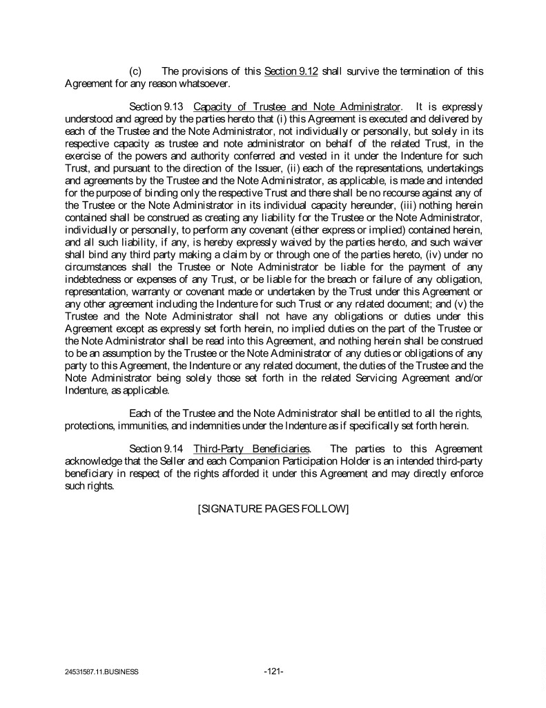 (c) The provisions of this Section 9.12 shall survive the termination of this Agreement for any reason whatsoever. Section 9.13 Capacity of Trustee and Note Administrator. It is expressly understood and agreed by the parties hereto that (i) this Agreement is executed and delivered by each of the Trustee and the Note Administrator, not individually or personally, but solely in its respective capacity as trustee and note administrator on behalf of the related Trust, in the exercise of the powers and authority conferred and vested in it under the Indenture for such Trust, and pursuant to the direction of the Issuer, (ii) each of the representations, undertakings and agreements by the Trustee and the Note Administrator, as applicable, is made and intended for the purpose of binding only the respective Trust and there shall be no recourse against any of the Trustee or the Note Administrator in its individual capacity hereunder, (iii) nothing herein contained shall be construed as creating any liability for the Trustee or the Note Administrator, individually or personally, to perform any covenant (either express or implied) contained herein, and all such liability, if any, is hereby expressly waived by the parties hereto, and such waiver shall bind any third party making a claim by or through one of the parties hereto, (iv) under no circumstances shall the Trustee or Note Administrator be liable for the payment of any indebtedness or expenses of any Trust, or be liable for the breach or failure of any obligation, representation, warranty or covenant made or undertaken by the Trust under this Agreement or any other agreement including the Indenture for such Trust or any related document; and (v) the Trustee and the Note Administrator shall not have any obligations or duties under this Agreement except as expressly set forth herein, no implied duties on the part of the Trustee or the Note Administrator shall be read into this Agreement, and nothing herein shall be construed to be an assumption by the Trustee or the Note Administrator of any duties or obligations of any party to this Agreement, the Indenture or any related document, the duties of the Trustee and the Note Administrator being solely those set forth in the related Servicing Agreement and/or Indenture, as applicable. Each of the Trustee and the Note Administrator shall be entitled to all the rights, protections, immunities, and indemnities under the Indenture as if specifically set forth herein. Section 9.14 Third-Party Beneficiaries. The parties to this Agreement acknowledge that the Seller and each Companion Participation Holder is an intended third-party beneficiary in respect of the rights afforded it under this Agreement and may directly enforce such rights. [SIGNATURE PAGES FOLLOW] 24531587.11.BUSINESS -121-