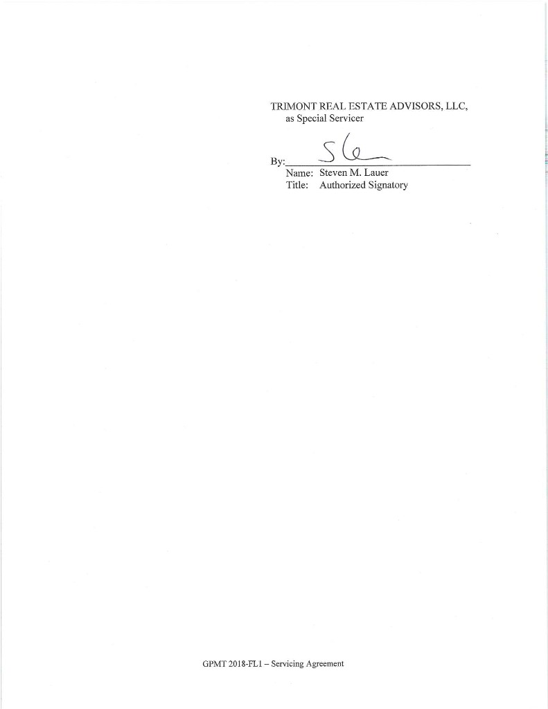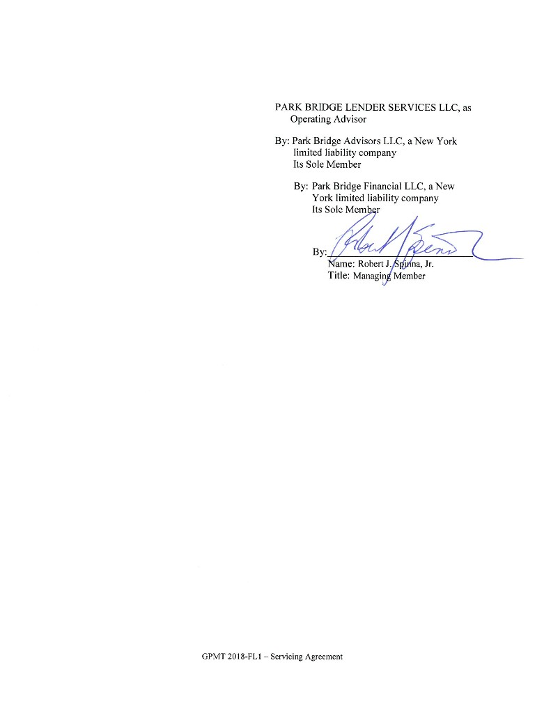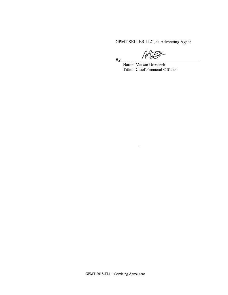 EXECUTION VERSION SERVICING AGREEMENT Dated as of May 9, 2018 by and among GPMT 2018-FL1, LTD. “Issuer” WILMINGTON TRUST, NATIONAL ASSOCIATION “Trustee” WELLS FARGO BANK, NATIONAL ASSOCIATION “Note Administrator” GPMT SELLER LLC “Advancing Agent” WELLS FARGO BANK, NATIONAL ASSOCIATION “Servicer” TRIMONT REAL ESTATE ADVISORS, LLC “Special Servicer” and PARK BRIDGE LENDER SERVICES LLC “Operating Advisor” 24531587.11.BUSINESS