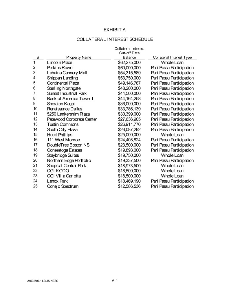 EXHIBIT A COLLATERAL INTEREST SCHEDULE Collateral Interest Cut-off Date # Property Name Balance Collateral Interest Type 1 Lincoln Place $62,275,000 Whole Loan 2 Perkins Rowe $60,000,000 Pari Passu Participation 3 Lahaina Cannery Mall $54,315,589 Pari Passu Participation 4 Shippan Landing $53,750,000 Pari Passu Participation 5 Continental Plaza $49,146,787 Pari Passu Participation 6 Sterling Northgate $48,200,000 Pari Passu Participation 7 Sunset Industrial Park $44,500,000 Pari Passu Participation 8 Bank of America Tower I $44,164,258 Pari Passu Participation 9 Sheraton Kauai $36,000,000 Pari Passu Participation 10 Renaissance Dallas $33,786,139 Pari Passu Participation 11 5250 Lankershim Plaza $30,399,000 Pari Passu Participation 12 Patewood Corporate Center $27,636,905 Pari Passu Participation 13 Tustin Commons $26,911,770 Pari Passu Participation 14 South City Plaza $26,087,292 Pari Passu Participation 15 Hotel Phillips $25,000,000 Whole Loan 16 111 West Monroe $24,408,824 Pari Passu Participation 17 DoubleTree Boston NS $23,500,000 Pari Passu Participation 18 Consestoga Estates $19,893,000 Pari Passu Participation 19 Staybridge Suites $19,750,000 Whole Loan 20 Northern Edge Portfolio $19,337,500 Pari Passu Participation 21 Shops at Central Park $18,973,500 Whole Loan 22 CGI KODO $18,500,000 Whole Loan 23 CGI Villa Carlotta $18,500,000 Whole Loan 24 Lenox Park $18,469,190 Pari Passu Participation 25 Conejo Spectrum $12,586,536 Pari Passu Participation 24531587.11.BUSINESS A-1