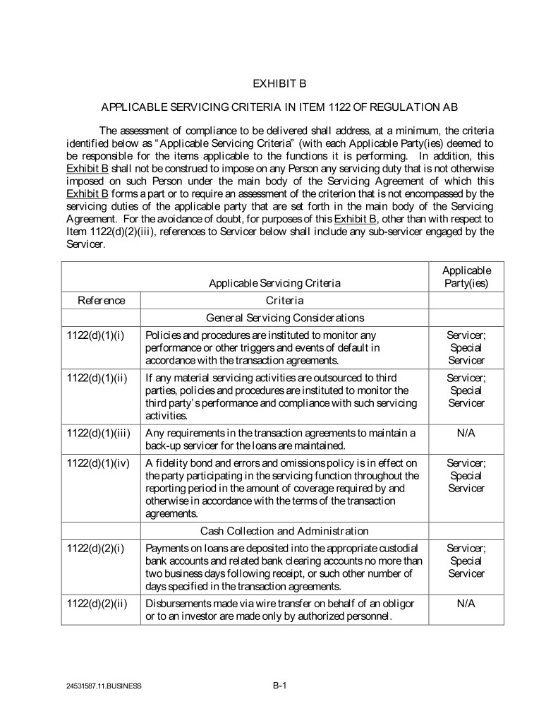 EXHIBIT B APPLICABLE SERVICING CRITERIA IN ITEM 1122 OF REGULATION AB The assessment of compliance to be delivered shall address, at a minimum, the criteria identified below as “Applicable Servicing Criteria” (with each Applicable Party(ies) deemed to be responsible for the items applicable to the functions it is performing. In addition, this Exhibit B shall not be construed to impose on any Person any servicing duty that is not otherwise imposed on such Person under the main body of the Servicing Agreement of which this Exhibit B forms a part or to require an assessment of the criterion that is not encompassed by the servicing duties of the applicable party that are set forth in the main body of the Servicing Agreement. For the avoidance of doubt, for purposes of this Exhibit B, other than with respect to Item 1122(d)(2)(iii), references to Servicer below shall include any sub-servicer engaged by the Servicer. Applicable Applicable Servicing Criteria Party(ies) Reference Criteria General Servicing Considerations 1122(d)(1)(i) Policies and procedures are instituted to monitor any Servicer; performance or other triggers and events of default in Special accordance with the transaction agreements. Servicer 1122(d)(1)(ii) If any material servicing activities are outsourced to third Servicer; parties, policies and procedures are instituted to monitor the Special third party’s performance and compliance with such servicing Servicer activities. 1122(d)(1)(iii) Any requirements in the transaction agreements to maintain a N/A back-up servicer for the loans are maintained. 1122(d)(1)(iv) A fidelity bond and errors and omissions policy is in effect on Servicer; the party participating in the servicing function throughout the Special reporting period in the amount of coverage required by and Servicer otherwise in accordance with the terms of the transaction agreements. Cash Collection and Administration 1122(d)(2)(i) Payments on loans are deposited into the appropriate custodial Servicer; bank accounts and related bank clearing accounts no more than Special two business days following receipt, or such other number of Servicer days specified in the transaction agreements. 1122(d)(2)(ii) Disbursements made via wire transfer on behalf of an obligor N/A or to an investor are made only by authorized personnel. 24531587.11.BUSINESS B-1