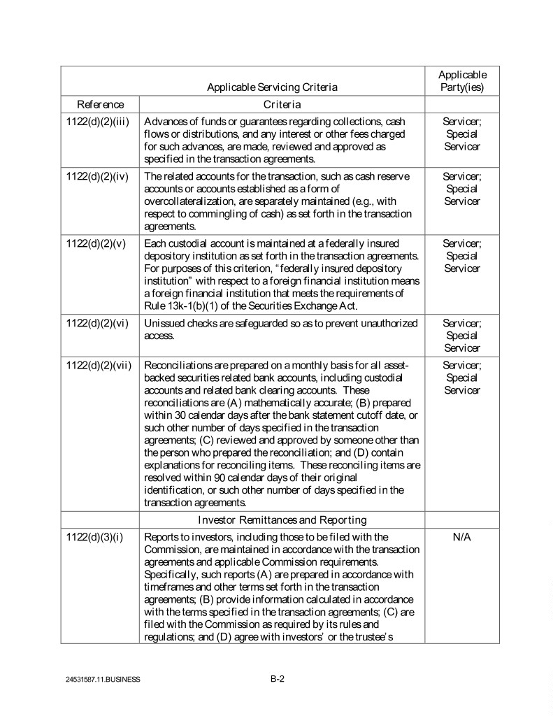 Applicable Applicable Servicing Criteria Party(ies) Reference Criteria 1122(d)(2)(iii) Advances of funds or guarantees regarding collections, cash Servicer; flows or distributions, and any interest or other fees charged Special for such advances, are made, reviewed and approved as Servicer specified in the transaction agreements. 1122(d)(2)(iv) The related accounts for the transaction, such as cash reserve Servicer; accounts or accounts established as a form of Special overcollateralization, are separately maintained (e.g., with Servicer respect to commingling of cash) as set forth in the transaction agreements. 1122(d)(2)(v) Each custodial account is maintained at a federally insured Servicer; depository institution as set forth in the transaction agreements. Special For purposes of this criterion, “federally insured depository Servicer institution” with respect to a foreign financial institution means a foreign financial institution that meets the requirements of Rule 13k-1(b)(1) of the Securities Exchange Act. 1122(d)(2)(vi) Unissued checks are safeguarded so as to prevent unauthorized Servicer; access. Special Servicer 1122(d)(2)(vii) Reconciliations are prepared on a monthly basis for all asset- Servicer; backed securities related bank accounts, including custodial Special accounts and related bank clearing accounts. These Servicer reconciliations are (A) mathematically accurate; (B) prepared within 30 calendar days after the bank statement cutoff date, or such other number of days specified in the transaction agreements; (C) reviewed and approved by someone other than the person who prepared the reconciliation; and (D) contain explanations for reconciling items. These reconciling items are resolved within 90 calendar days of their original identification, or such other number of days specified in the transaction agreements. Investor Remittances and Reporting 1122(d)(3)(i) Reports to investors, including those to be filed with the N/A Commission, are maintained in accordance with the transaction agreements and applicable Commission requirements. Specifically, such reports (A) are prepared in accordance with timeframes and other terms set forth in the transaction agreements; (B) provide information calculated in accordance with the terms specified in the transaction agreements; (C) are filed with the Commission as required by its rules and regulations; and (D) agree with investors’ or the trustee’s 24531587.11.BUSINESS B-2