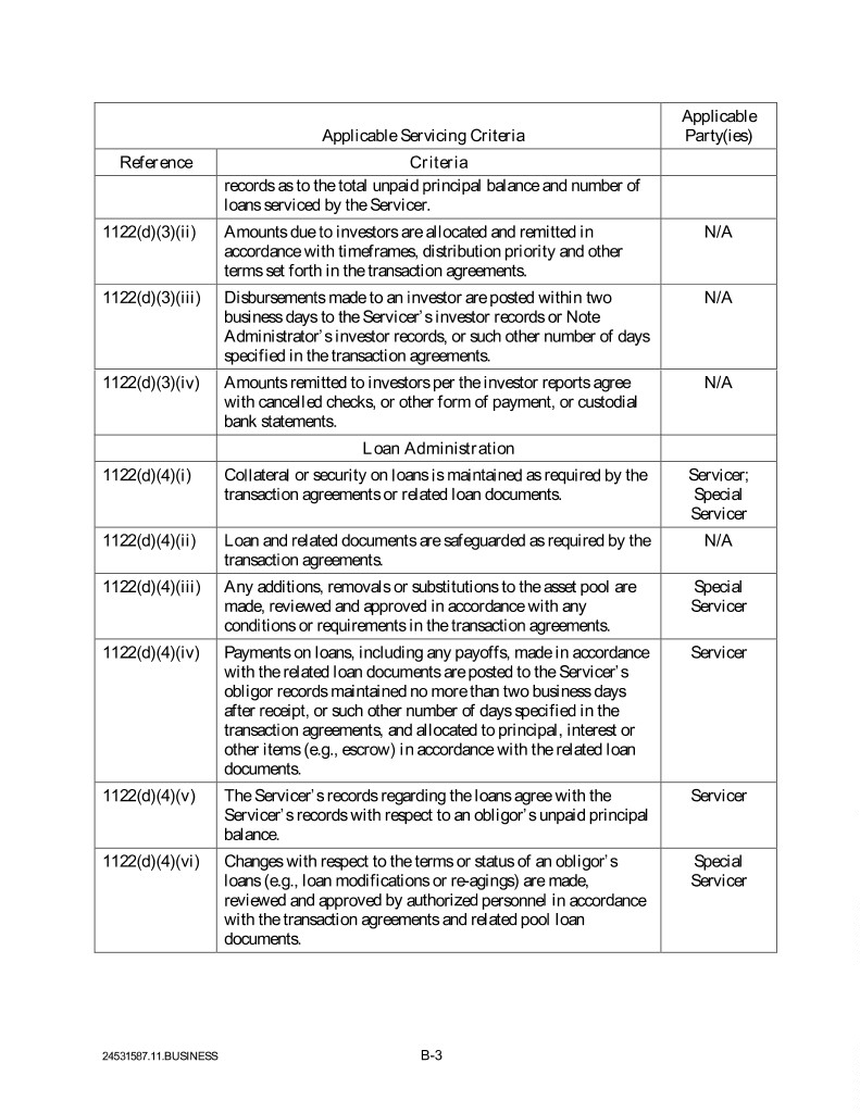 Applicable Applicable Servicing Criteria Party(ies) Reference Criteria records as to the total unpaid principal balance and number of loans serviced by the Servicer. 1122(d)(3)(ii) Amounts due to investors are allocated and remitted in N/A accordance with timeframes, distribution priority and other terms set forth in the transaction agreements. 1122(d)(3)(iii) Disbursements made to an investor are posted within two N/A business days to the Servicer’s investor records or Note Administrator’s investor records, or such other number of days specified in the transaction agreements. 1122(d)(3)(iv) Amounts remitted to investors per the investor reports agree N/A with cancelled checks, or other form of payment, or custodial bank statements. Loan Administration 1122(d)(4)(i) Collateral or security on loans is maintained as required by the Servicer; transaction agreements or related loan documents. Special Servicer 1122(d)(4)(ii) Loan and related documents are safeguarded as required by the N/A transaction agreements. 1122(d)(4)(iii) Any additions, removals or substitutions to the asset pool are Special made, reviewed and approved in accordance with any Servicer conditions or requirements in the transaction agreements. 1122(d)(4)(iv) Payments on loans, including any payoffs, made in accordance Servicer with the related loan documents are posted to the Servicer’s obligor records maintained no more than two business days after receipt, or such other number of days specified in the transaction agreements, and allocated to principal, interest or other items (e.g., escrow) in accordance with the related loan documents. 1122(d)(4)(v) The Servicer’s records regarding the loans agree with the Servicer Servicer’s records with respect to an obligor’s unpaid principal balance. 1122(d)(4)(vi) Changes with respect to the terms or status of an obligor’s Special loans (e.g., loan modifications or re-agings) are made, Servicer reviewed and approved by authorized personnel in accordance with the transaction agreements and related pool loan documents. 24531587.11.BUSINESS B-3