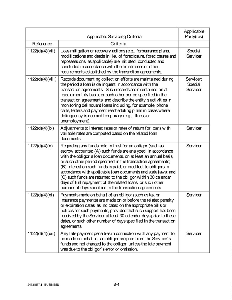 Applicable Applicable Servicing Criteria Party(ies) Reference Criteria 1122(d)(4)(vii) Loss mitigation or recovery actions (e.g., forbearance plans, Special modifications and deeds in lieu of foreclosure, foreclosures and Servicer repossessions, as applicable) are initiated, conducted and concluded in accordance with the timeframes or other requirements established by the transaction agreements. 1122(d)(4)(viii) Records documenting collection efforts are maintained during Servicer; the period a loan is delinquent in accordance with the Special transaction agreements. Such records are maintained on at Servicer least a monthly basis, or such other period specified in the transaction agreements, and describe the entity’s activities in monitoring delinquent loans including, for example, phone calls, letters and payment rescheduling plans in cases where delinquency is deemed temporary (e.g., illness or unemployment). 1122(d)(4)(ix) Adjustments to interest rates or rates of return for loans with Servicer variable rates are computed based on the related loan documents. 1122(d)(4)(x) Regarding any funds held in trust for an obligor (such as Servicer escrow accounts): (A) such funds are analyzed, in accordance with the obligor’s loan documents, on at least an annual basis, or such other period specified in the transaction agreements; (B) interest on such funds is paid, or credited, to obligors in accordance with applicable loan documents and state laws; and (C) such funds are returned to the obligor within 30 calendar days of full repayment of the related loans, or such other number of days specified in the transaction agreements. 1122(d)(4)(xi) Payments made on behalf of an obligor (such as tax or Servicer insurance payments) are made on or before the related penalty or expiration dates, as indicated on the appropriate bills or notices for such payments, provided that such support has been received by the Servicer at least 30 calendar days prior to these dates, or such other number of days specified in the transaction agreements. 1122(d)(4)(xii) Any late payment penalties in connection with any payment to Servicer be made on behalf of an obligor are paid from the Servicer’s funds and not charged to the obligor, unless the late payment was due to the obligor’s error or omission. 24531587.11.BUSINESS B-4