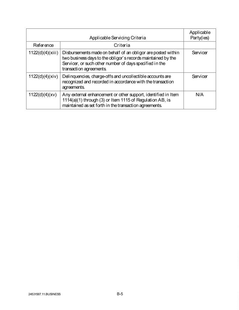 Applicable Applicable Servicing Criteria Party(ies) Reference Criteria 1122(d)(4)(xiii) Disbursements made on behalf of an obligor are posted within Servicer two business days to the obligor’s records maintained by the Servicer, or such other number of days specified in the transaction agreements. 1122(d)(4)(xiv) Delinquencies, charge-offs and uncollectible accounts are Servicer recognized and recorded in accordance with the transaction agreements. 1122(d)(4)(xv) Any external enhancement or other support, identified in Item N/A 1114(a)(1) through (3) or Item 1115 of Regulation AB, is maintained as set forth in the transaction agreements. 24531587.11.BUSINESS B-5