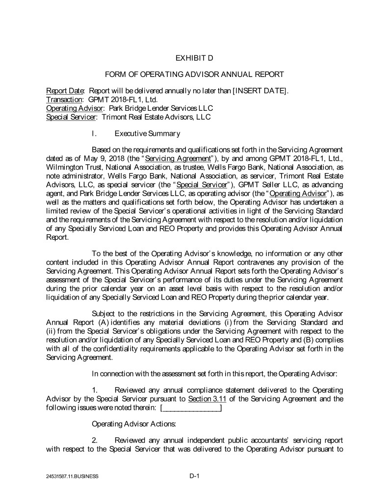 EXHIBIT D FORM OF OPERATING ADVISOR ANNUAL REPORT Report Date: Report will be delivered annually no later than [INSERT DATE]. Transaction: GPMT 2018-FL1, Ltd. Operating Advisor: Park Bridge Lender Services LLC Special Servicer: Trimont Real Estate Advisors, LLC I. Executive Summary Based on the requirements and qualifications set forth in the Servicing Agreement dated as of May 9, 2018 (the “Servicing Agreement”), by and among GPMT 2018-FL1, Ltd., Wilmington Trust, National Association, as trustee, Wells Fargo Bank, National Association, as note administrator, Wells Fargo Bank, National Association, as servicer, Trimont Real Estate Advisors, LLC, as special servicer (the “Special Servicer”), GPMT Seller LLC, as advancing agent, and Park Bridge Lender Services LLC, as operating advisor (the “Operating Advisor”), as well as the matters and qualifications set forth below, the Operating Advisor has undertaken a limited review of the Special Servicer’s operational activities in light of the Servicing Standard and the requirements of the Servicing Agreement with respect to the resolution and/or liquidation of any Specially Serviced Loan and REO Property and provides this Operating Advisor Annual Report. To the best of the Operating Advisor’s knowledge, no information or any other content included in this Operating Advisor Annual Report contravenes any provision of the Servicing Agreement. This Operating Advisor Annual Report sets forth the Operating Advisor’s assessment of the Special Servicer’s performance of its duties under the Servicing Agreement during the prior calendar year on an asset level basis with respect to the resolution and/or liquidation of any Specially Serviced Loan and REO Property during the prior calendar year. Subject to the restrictions in the Servicing Agreement, this Operating Advisor Annual Report (A) identifies any material deviations (i) from the Servicing Standard and (ii) from the Special Servicer’s obligations under the Servicing Agreement with respect to the resolution and/or liquidation of any Specially Serviced Loan and REO Property and (B) complies with all of the confidentiality requirements applicable to the Operating Advisor set forth in the Servicing Agreement. In connection with the assessment set forth in this report, the Operating Advisor: 1. Reviewed any annual compliance statement delivered to the Operating Advisor by the Special Servicer pursuant to Section 3.11 of the Servicing Agreement and the following issues were noted therein: [_______________] Operating Advisor Actions: 2. Reviewed any annual independent public accountants’ servicing report with respect to the Special Servicer that was delivered to the Operating Advisor pursuant to 24531587.11.BUSINESS D-1