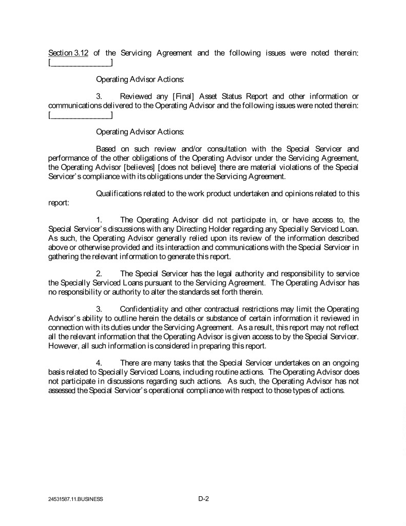 Section 3.12 of the Servicing Agreement and the following issues were noted therein: [_______________] Operating Advisor Actions: 3. Reviewed any [Final] Asset Status Report and other information or communications delivered to the Operating Advisor and the following issues were noted therein: [_______________] Operating Advisor Actions: Based on such review and/or consultation with the Special Servicer and performance of the other obligations of the Operating Advisor under the Servicing Agreement, the Operating Advisor [believes] [does not believe] there are material violations of the Special Servicer’s compliance with its obligations under the Servicing Agreement. Qualifications related to the work product undertaken and opinions related to this report: 1. The Operating Advisor did not participate in, or have access to, the Special Servicer’s discussions with any Directing Holder regarding any Specially Serviced Loan. As such, the Operating Advisor generally relied upon its review of the information described above or otherwise provided and its interaction and communications with the Special Servicer in gathering the relevant information to generate this report. 2. The Special Servicer has the legal authority and responsibility to service the Specially Serviced Loans pursuant to the Servicing Agreement. The Operating Advisor has no responsibility or authority to alter the standards set forth therein. 3. Confidentiality and other contractual restrictions may limit the Operating Advisor’s ability to outline herein the details or substance of certain information it reviewed in connection with its duties under the Servicing Agreement. As a result, this report may not reflect all the relevant information that the Operating Advisor is given access to by the Special Servicer. However, all such information is considered in preparing this report. 4. There are many tasks that the Special Servicer undertakes on an ongoing basis related to Specially Serviced Loans, including routine actions. The Operating Advisor does not participate in discussions regarding such actions. As such, the Operating Advisor has not assessed the Special Servicer’s operational compliance with respect to those types of actions. 24531587.11.BUSINESS D-2