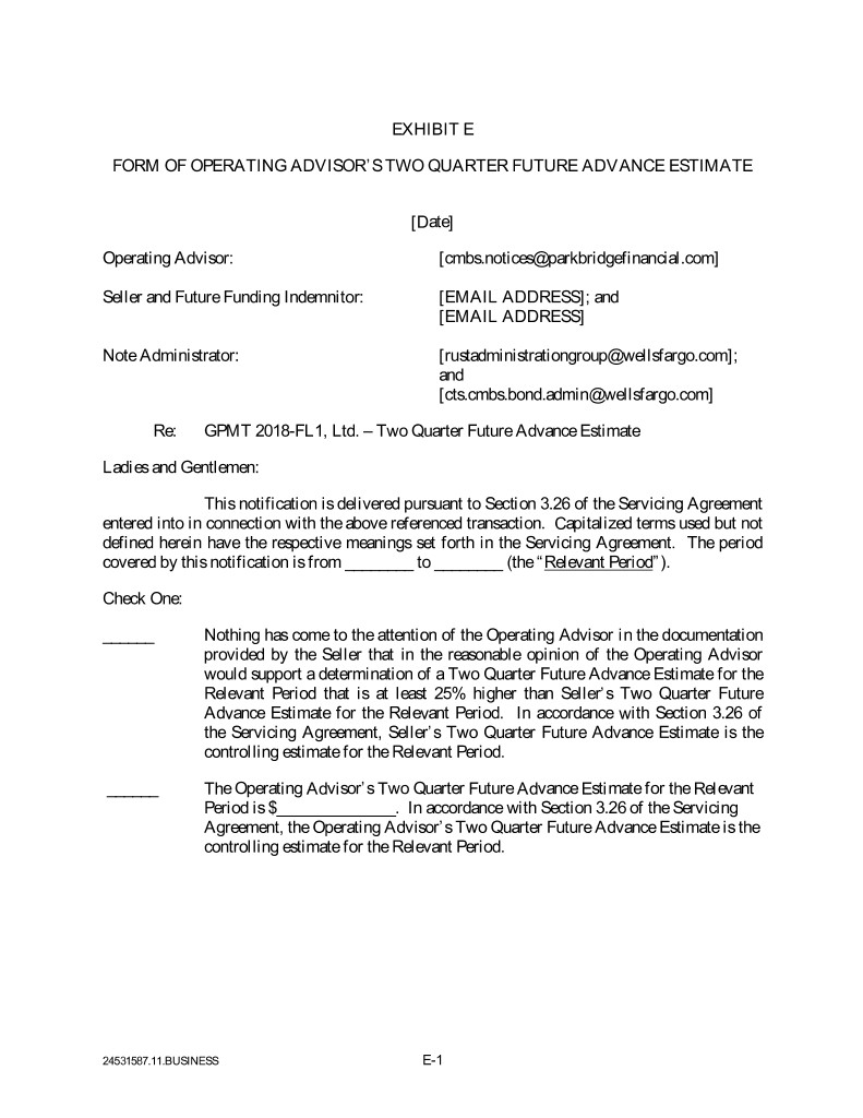 EXHIBIT E FORM OF OPERATING ADVISOR’S TWO QUARTER FUTURE ADVANCE ESTIMATE [Date] Operating Advisor: [cmbs.notices@parkbridgefinancial.com] Seller and Future Funding Indemnitor: [EMAIL ADDRESS]; and [EMAIL ADDRESS] Note Administrator: [rustadministrationgroup@wellsfargo.com]; and [cts.cmbs.bond.admin@wellsfargo.com] Re: GPMT 2018-FL1, Ltd. – Two Quarter Future Advance Estimate Ladies and Gentlemen: This notification is delivered pursuant to Section 3.26 of the Servicing Agreement entered into in connection with the above referenced transaction. Capitalized terms used but not defined herein have the respective meanings set forth in the Servicing Agreement. The period covered by this notification is from ________ to ________ (the “Relevant Period”). Check One: ______ Nothing has come to the attention of the Operating Advisor in the documentation provided by the Seller that in the reasonable opinion of the Operating Advisor would support a determination of a Two Quarter Future Advance Estimate for the Relevant Period that is at least 25% higher than Seller’s Two Quarter Future Advance Estimate for the Relevant Period. In accordance with Section 3.26 of the Servicing Agreement, Seller’s Two Quarter Future Advance Estimate is the controlling estimate for the Relevant Period. ______ The Operating Advisor’s Two Quarter Future Advance Estimate for the Relevant Period is $______________. In accordance with Section 3.26 of the Servicing Agreement, the Operating Advisor’s Two Quarter Future Advance Estimate is the controlling estimate for the Relevant Period. 24531587.11.BUSINESS E-1