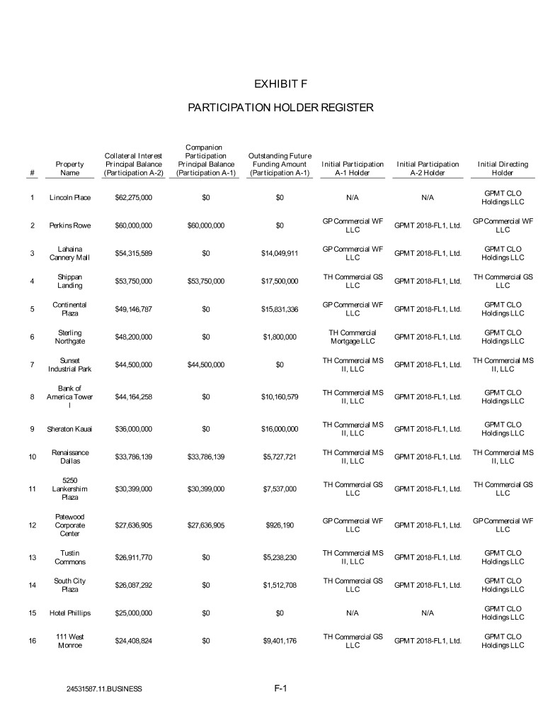 EXHIBIT F PARTICIPATION HOLDER REGISTER Companion Collateral Interest Participation Outstanding Future Property Principal Balance Principal Balance Funding Amount Initial Participation Initial Participation Initial Directing # Name (Participation A-2) (Participation A-1) (Participation A-1) A-1 Holder A-2 Holder Holder GPMT CLO 1 Lincoln Place $62,275,000 $0 $0 N/A N/A Holdings LLC GP Commercial WF GP Commercial WF 2 Perkins Rowe $60,000,000 $60,000,000 $0 GPMT 2018-FL1, Ltd. LLC LLC Lahaina GP Commercial WF GPMT CLO 3 $54,315,589 $0 $14,049,911 GPMT 2018-FL1, Ltd. Cannery Mall LLC Holdings LLC Shippan TH Commercial GS TH Commercial GS 4 $53,750,000 $53,750,000 $17,500,000 GPMT 2018-FL1, Ltd. Landing LLC LLC Continental GP Commercial WF GPMT CLO 5 $49,146,787 $0 $15,831,336 GPMT 2018-FL1, Ltd. Plaza LLC Holdings LLC Sterling TH Commercial GPMT CLO 6 $48,200,000 $0 $1,800,000 GPMT 2018-FL1, Ltd. Northgate Mortgage LLC Holdings LLC Sunset TH Commercial MS TH Commercial MS 7 $44,500,000 $44,500,000 $0 GPMT 2018-FL1, Ltd. Industrial Park II, LLC II, LLC Bank of TH Commercial MS GPMT CLO 8 America Tower $44,164,258 $0 $10,160,579 GPMT 2018-FL1, Ltd. II, LLC Holdings LLC I TH Commercial MS GPMT CLO 9 Sheraton Kauai $36,000,000 $0 $16,000,000 GPMT 2018-FL1, Ltd. II, LLC Holdings LLC Renaissance TH Commercial MS TH Commercial MS 10 $33,786,139 $33,786,139 $5,727,721 GPMT 2018-FL1, Ltd. Dallas II, LLC II, LLC 5250 TH Commercial GS TH Commercial GS 11 Lankershim $30,399,000 $30,399,000 $7,537,000 GPMT 2018-FL1, Ltd. LLC LLC Plaza Patewood GP Commercial WF GP Commercial WF 12 Corporate $27,636,905 $27,636,905 $926,190 GPMT 2018-FL1, Ltd. LLC LLC Center Tustin TH Commercial MS GPMT CLO 13 $26,911,770 $0 $5,238,230 GPMT 2018-FL1, Ltd. Commons II, LLC Holdings LLC South City TH Commercial GS GPMT CLO 14 $26,087,292 $0 $1,512,708 GPMT 2018-FL1, Ltd. Plaza LLC Holdings LLC GPMT CLO 15 Hotel Phillips $25,000,000 $0 $0 N/A N/A Holdings LLC 111 West TH Commercial GS GPMT CLO 16 $24,408,824 $0 $9,401,176 GPMT 2018-FL1, Ltd. Monroe LLC Holdings LLC 24531587.11.BUSINESS F-1