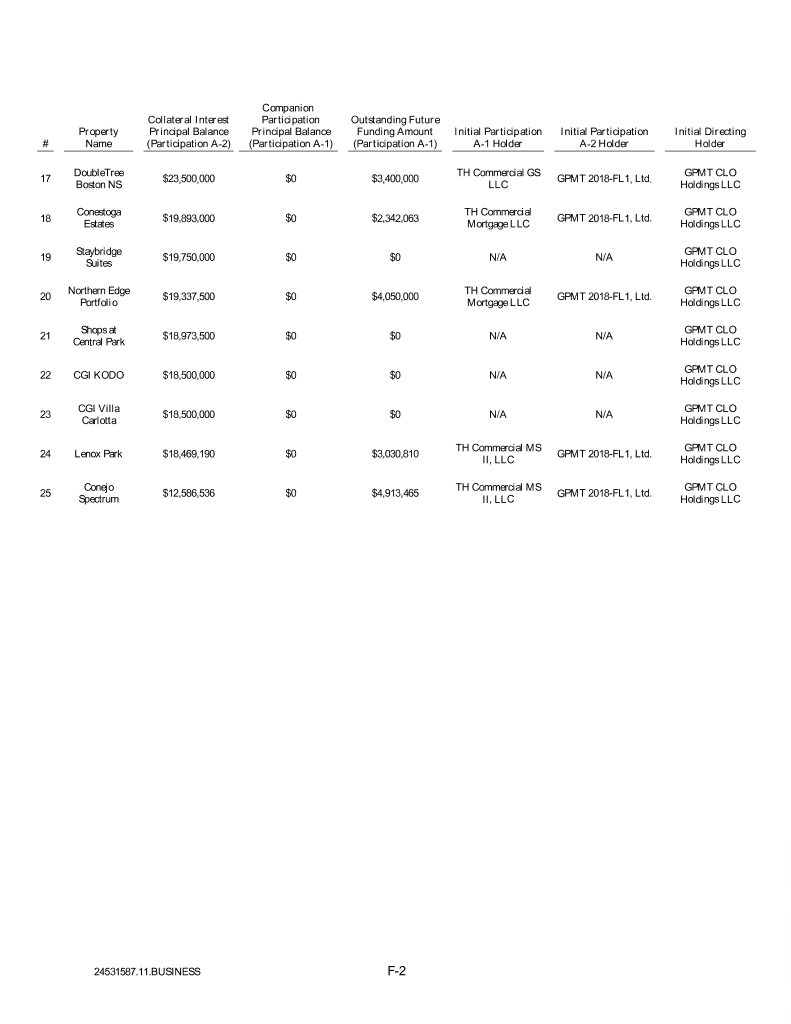Companion Collateral Interest Participation Outstanding Future Property Principal Balance Principal Balance Funding Amount Initial Participation Initial Participation Initial Directing # Name (Participation A-2) (Participation A-1) (Participation A-1) A-1 Holder A-2 Holder Holder DoubleTree TH Commercial GS GPMT CLO 17 $23,500,000 $0 $3,400,000 GPMT 2018-FL1, Ltd. Boston NS LLC Holdings LLC Conestoga TH Commercial GPMT CLO 18 $19,893,000 $0 $2,342,063 GPMT 2018-FL1, Ltd. Estates Mortgage LLC Holdings LLC Staybridge GPMT CLO 19 $19,750,000 $0 $0 N/A N/A Suites Holdings LLC Northern Edge TH Commercial GPMT CLO 20 $19,337,500 $0 $4,050,000 GPMT 2018-FL1, Ltd. Portfolio Mortgage LLC Holdings LLC Shops at GPMT CLO 21 $18,973,500 $0 $0 N/A N/A Central Park Holdings LLC GPMT CLO 22 CGI KODO $18,500,000 $0 $0 N/A N/A Holdings LLC CGI Villa GPMT CLO 23 $18,500,000 $0 $0 N/A N/A Carlotta Holdings LLC TH Commercial MS GPMT CLO 24 Lenox Park $18,469,190 $0 $3,030,810 GPMT 2018-FL1, Ltd. II, LLC Holdings LLC Conejo TH Commercial MS GPMT CLO 25 $12,586,536 $0 $4,913,465 GPMT 2018-FL1, Ltd. Spectrum II, LLC Holdings LLC 24531587.11.BUSINESS F-2
