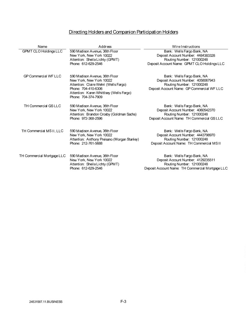 Directing Holders and Companion Participation Holders Name Address Wire Instructions GPMT CLO Holdings LLC 590 Madison Avenue, 36th Floor Bank: Wells Fargo Bank, NA New York, New York 10022 Deposit Account Number: 4484383328 Attention: Sheila Lichty (GPMT) Routing Number: 121000248 Phone: 612-629-2546 Deposit Account Name: GPMT CLO Holdings LLC GP Commercial WF LLC 590 Madison Avenue, 36th Floor Bank: Wells Fargo Bank, NA New York, New York 10022 Deposit Account Number: 4058067943 Attention: Claire Wehri (Wells Fargo) Routing Number: 121000248 Phone: 704-410-6306 Deposit Account Name: GP Commercial WF LLC Attention: Karen Whittlsey (Wells Fargo) Phone: 704-374-7909 TH Commercial GS LLC 590 Madison Avenue, 36th Floor Bank: Wells Fargo Bank, NA New York, New York 10022 Deposit Account Number: 4060542370 Attention: Brandon Crosby (Goldman Sachs) Routing Number: 121000248 Phone: 972-368-2596 Deposit Account Name: TH Commercial GS LLC TH Commercial MS II, LLC 590 Madison Avenue, 36th Floor Bank: Wells Fargo Bank, NA New York, New York 10022 Deposit Account Number: 4443798970 Attention: Anthony Preisano (Morgan Stanley) Routing Number: 121000248 Phone: 212-761-5688 Deposit Account Name: TH Commercial MS II TH Commercial Mortgage LLC 590 Madison Avenue, 36th Floor Bank: Wells Fargo Bank, NA New York, New York 10022 Deposit Account Number: 4129235511 Attention: Sheila Lichty (GPMT) Routing Number: 121000248 Phone: 612-629-2546 Deposit Account Name: TH Commercial Mortgage LLC 24531587.11.BUSINESS F-3