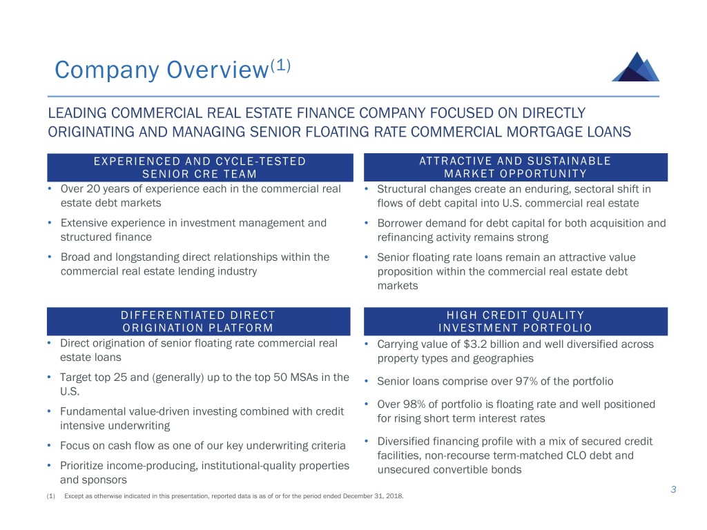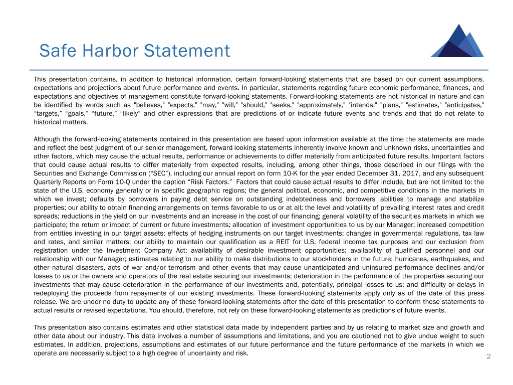 Safe Harbor Statement This presentation contains, in addition to historical information, certain forward-looking statements that are based on our current assumptions, expectations and projections about future performance and events. In particular, statements regarding future economic performance, finances, and expectations and objectives of management constitute forward-looking statements. Forward-looking statements are not historical in nature and can be identified by words such as "believes," "expects," "may," "will," "should," "seeks," "approximately," "intends," "plans," "estimates," "anticipates," “targets,” “goals,” “future,” “likely” and other expressions that are predictions of or indicate future events and trends and that do not relate to historical matters. Although the forward-looking statements contained in this presentation are based upon information available at the time the statements are made and reflect the best judgment of our senior management, forward-looking statements inherently involve known and unknown risks, uncertainties and other factors, which may cause the actual results, performance or achievements to differ materially from anticipated future results. Important factors that could cause actual results to differ materially from expected results, including, among other things, those described in our filings with the Securities and Exchange Commission (“SEC”), including our annual report on form 10-K for the year ended December 31, 2017, and any subsequent Quarterly Reports on Form 10-Q under the caption “Risk Factors.” Factors that could cause actual results to differ include, but are not limited to: the state of the U.S. economy generally or in specific geographic regions; the general political, economic, and competitive conditions in the markets in which we invest; defaults by borrowers in paying debt service on outstanding indebtedness and borrowers' abilities to manage and stabilize properties; our ability to obtain financing arrangements on terms favorable to us or at all; the level and volatility of prevailing interest rates and credit spreads; reductions in the yield on our investments and an increase in the cost of our financing; general volatility of the securities markets in which we participate; the return or impact of current or future investments; allocation of investment opportunities to us by our Manager; increased competition from entities investing in our target assets; effects of hedging instruments on our target investments; changes in governmental regulations, tax law and rates, and similar matters; our ability to maintain our qualification as a REIT for U.S. federal income tax purposes and our exclusion from registration under the Investment Company Act; availability of desirable investment opportunities; availability of qualified personnel and our relationship with our Manager; estimates relating to our ability to make distributions to our stockholders in the future; hurricanes, earthquakes, and other natural disasters, acts of war and/or terrorism and other events that may cause unanticipated and uninsured performance declines and/or losses to us or the owners and operators of the real estate securing our investments; deterioration in the performance of the properties securing our investments that may cause deterioration in the performance of our investments and, potentially, principal losses to us; and difficulty or delays in redeploying the proceeds from repayments of our existing investments. These forward-looking statements apply only as of the date of this press release. We are under no duty to update any of these forward-looking statements after the date of this presentation to conform these statements to actual results or revised expectations. You should, therefore, not rely on these forward-looking statements as predictions of future events. This presentation also contains estimates and other statistical data made by independent parties and by us relating to market size and growth and other data about our industry. This data involves a number of assumptions and limitations, and you are cautioned not to give undue weight to such estimates. In addition, projections, assumptions and estimates of our future performance and the future performance of the markets in which we operate are necessarily subject to a high degree of uncertainty and risk. 2