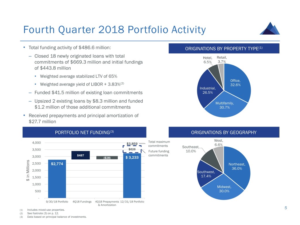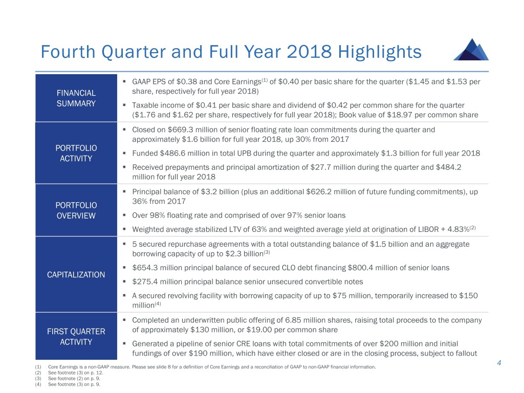 Fourth Quarter and Full Year 2018 Highlights . GAAP EPS of $0.38 and Core Earnings(1) of $0.40 per basic share for the quarter ($1.45 and $1.53 per FINANCIAL share, respectively for full year 2018) SUMMARY . Taxable income of $0.41 per basic share and dividend of $0.42 per common share for the quarter ($1.76 and $1.62 per share, respectively for full year 2018); Book value of $18.97 per common share . Closed on $669.3 million of senior floating rate loan commitments during the quarter and approximately $1.6 billion for full year 2018, up 30% from 2017 PORTFOLIO . Funded $486.6 million in total UPB during the quarter and approximately $1.3 billion for full year 2018 ACTIVITY . Received prepayments and principal amortization of $27.7 million during the quarter and $484.2 million for full year 2018 . Principal balance of $3.2 billion (plus an additional $626.2 million of future funding commitments), up PORTFOLIO 36% from 2017 OVERVIEW . Over 98% floating rate and comprised of over 97% senior loans . Weighted average stabilized LTV of 63% and weighted average yield at origination of LIBOR + 4.83%(2) . 5 secured repurchase agreements with a total outstanding balance of $1.5 billion and an aggregate borrowing capacity of up to $2.3 billion(3) . $654.3 million principal balance of secured CLO debt financing $800.4 million of senior loans CAPITALIZATION . $275.4 million principal balance senior unsecured convertible notes . A secured revolving facility with borrowing capacity of up to $75 million, temporarily increased to $150 million(4) . Completed an underwritten public offering of 6.85 million shares, raising total proceeds to the company FIRST QUARTER of approximately $130 million, or $19.00 per common share ACTIVITY . Generated a pipeline of senior CRE loans with total commitments of over $200 million and initial fundings of over $190 million, which have either closed or are in the closing process, subject to fallout 4 (1) Core Earnings is a non-GAAP measure. Please see slide 8 for a definition of Core Earnings and a reconciliation of GAAP to non-GAAP financial information. (2) See footnote (3) on p. 12. (3) See footnote (2) on p. 9. (4) See footnote (3) on p. 9.