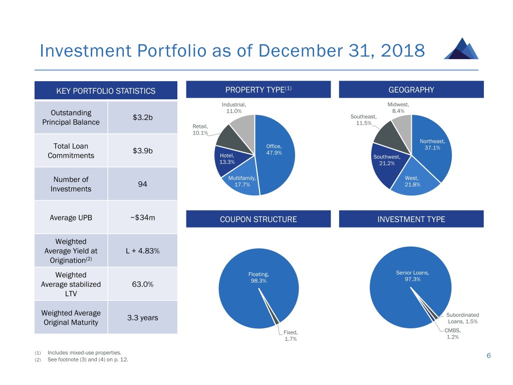 Investment Portfolio Detail(1) Maximum All-in Original Origination Loan Principal Carrying Cash Yield at Maturity Property Stabilized ($ in millions) Type Date Commitment Balance Value Coupon(2) Origination(3) (Years) State Type Initial LTV(5) LTV(6) Asset 1 Senior 07/18 144.3 112.9 111.5 L + 3.34% L + 4.27% 2.0 CA Retail 50.7% 55.9% Asset 2 Senior 09/17 125.0 108.0 107.3 L + 4.45% L + 5.03% 3.0 CT Office 62.9% 58.9% Asset 3 Senior 07/16 120.4 108.7 108.0 L + 4.45% L + 4.99% 4.0 Various Office 62.8% 61.5% Asset 4 Senior 12/15 119.9 119.9 119.8 L + 3.65% L + 4.43% 4.0 LA Mixed-Use 65.5% 60.0% Asset 5 Senior 12/18 92.0 27.0 26.0 L+3.75% L+5.21% 3.0 NY Mixed-Use 26.2% 47.6% Asset 6 Senior 04/16 89.0 89.0 89.0 L + 3.70% L + 5.44% 3.0 NY Industrial 75.9% 55.4% Asset 7 Senior 05/17 86.7 79.1 78.4 L + 3.50% L + 4.82% 4.0 MA Office 71.3% 71.5% Asset 8 Senior 11/16 82.3 59.0 58.6 L + 3.25% L + 5.78% 3.0 OR Office 66.5% 51.1% Asset 9 Senior 10/17 74.8 44.5 44.2 L + 4.07% L + 4.47% 4.0 DC Office 67.0% 66.0% Asset 10 Senior 11/17 73.3 68.8 68.2 L + 4.45% L + 5.20% 3.0 TX Hotel 68.2% 61.6% Asset 11 Senior 06/16 68.4 58.2 57.9 L + 3.87% L + 4.93% 4.0 HI Retail 76.2% 57.4% Asset 12 Senior 11/17 68.3 60.8 60.3 L + 4.10% L + 4.73% 3.0 CA Office 66.8% 67.0% Asset 13 Senior 08/16 65.0 63.5 63.1 L + 3.95% L + 5.54% 4.0 NJ Office 60.8% 63.0% Asset 14 Senior 04/18 64.0 64.0 63.5 L + 3.78% L + 4.23% 3.0 GA Hotel 68.8% 59.8% Asset 15 Senior 12/16 62.3 62.3 61.2 L + 3.30% L + 4.87% 4.0 FL Office 73.3% 63.2% Assets 16-94 Various Various 2,523.6 2,107.4 2,090.2 L + 4.18% L + 4.79% 3.2 Various Various 68.2% 64.5% Total/Weighted Average $3,859.3 $3,233.1 $3,207.2 L + 4.06% L + 4.83%(4) 3.3 67.1% 63.0% (1) As of December 31, 2018. (2) Cash coupon does not include origination or exit fees. (3) Provided for illustrative purposes only. Calculations of all-in yield at origination are based on a number of assumptions (some or all of which may not occur) and are expressed as monthly equivalent yields that include net origination fees and exit fees and exclude future fundings and any potential or completed loan amendments or modifications. (4) Calculations of all-in weighted average yield at origination exclude fixed rate loans. (5) Initial LTV is calculated as the initial loan amount (plus any financing that is pari passu with or senior to such loan) divided by the as is appraised value (as determined in conformance with USPAP) as of the 12 date the loan was originated set forth in the original appraisal. (6) Stabilized loan-to-value ratio (LTV) is calculated as the fully funded loan amount (plus any financing that is pari passu with or senior to such loan), including all contractually provided for future fundings, divided by the as stabilized value (as determined in conformance with USPAP) set forth in the original appraisal. As stabilized value may be based on certain assumptions, such as future construction completion, projected re-tenanting, payment of tenant improvement or leasing commissions allowances or free or abated rent periods, or increased tenant occupancies.