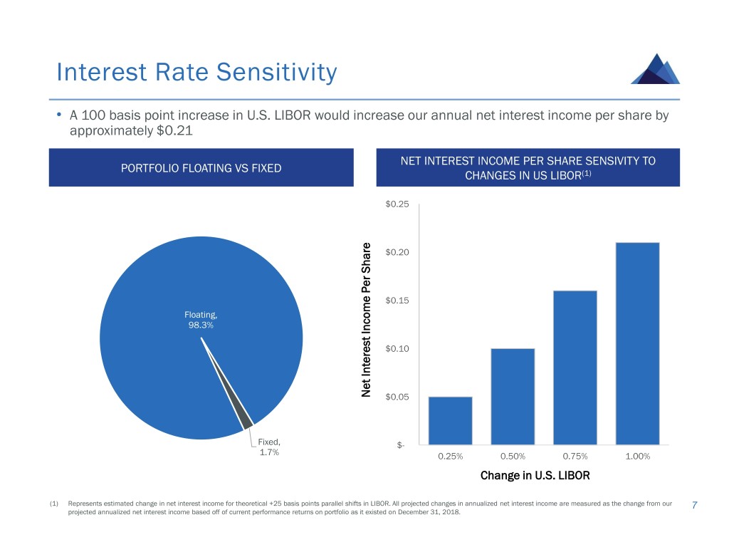 Interest Rate Sensitivity • A 100 basis point increase in U.S. LIBOR would increase our annual net interest income per share by approximately $0.21 NET INTEREST INCOME PER SHARE SENSIVITY TO PORTFOLIO FLOATING VS FIXED CHANGES IN US LIBOR(1) $0.25 $0.20 $0.15 Floating, 98.3% $0.10 Net Interest Income Per SharePerInterestIncomeNet $0.05 Fixed, $- 1.7% 0.25% 0.50% 0.75% 1.00% Change in U.S. LIBOR (1) Represents estimated change in net interest income for theoretical +25 basis points parallel shifts in LIBOR. All projected changes in annualized net interest income are measured as the change from our 7 projected annualized net interest income based off of current performance returns on portfolio as it existed on December 31, 2018.