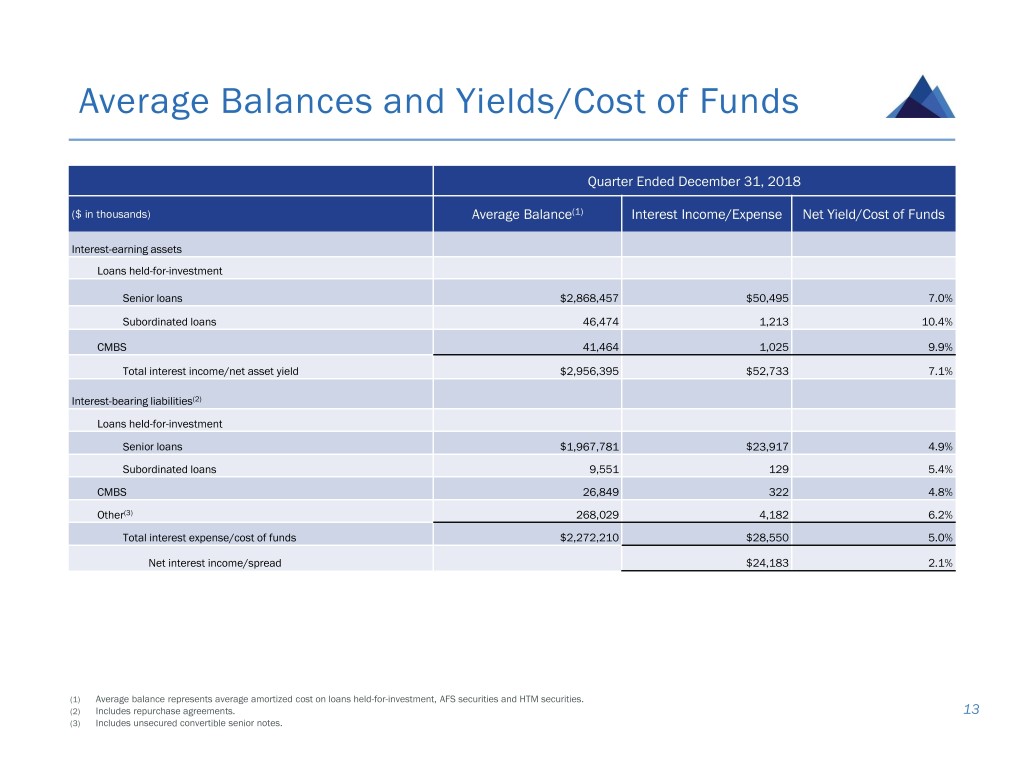 Average Balances and Yields/Cost of Funds Quarter Ended December 31, 2018 ($ in thousands) Average Balance(1) Interest Income/Expense Net Yield/Cost of Funds Interest-earning assets Loans held-for-investment Senior loans $2,868,457 $50,495 7.0% Subordinated loans 46,474 1,213 10.4% CMBS 41,464 1,025 9.9% Total interest income/net asset yield $2,956,395 $52,733 7.1% Interest-bearing liabilities(2) Loans held-for-investment Senior loans $1,967,781 $23,917 4.9% Subordinated loans 9,551 129 5.4% CMBS 26,849 322 4.8% Other(3) 268,029 4,182 6.2% Total interest expense/cost of funds $2,272,210 $28,550 5.0% Net interest income/spread $24,183 2.1% (1) Average balance represents average amortized cost on loans held-for-investment, AFS securities and HTM securities. (2) Includes repurchase agreements. 13 (3) Includes unsecured convertible senior notes.
