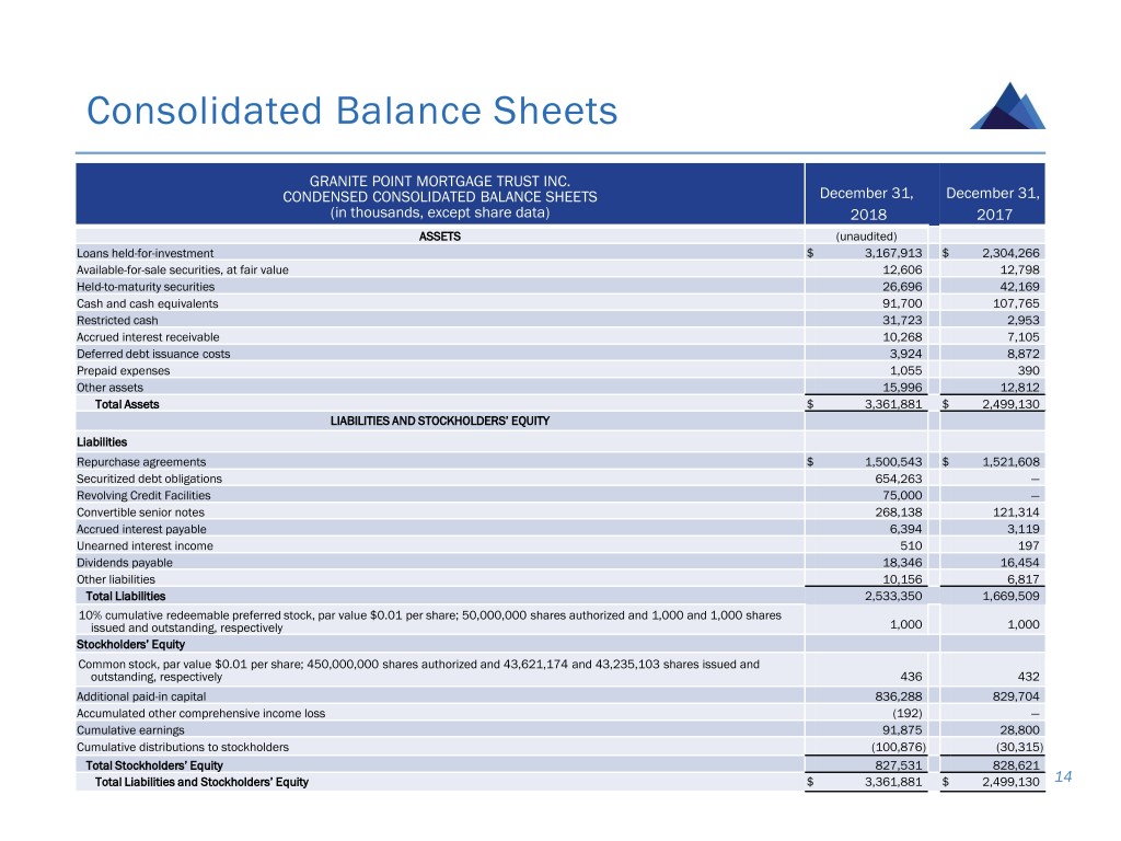 Consolidated Balance Sheets GRANITE POINT MORTGAGE TRUST INC. CONDENSED CONSOLIDATED BALANCE SHEETS December 31, December 31, (in thousands, except share data) 2018 2017 ASSETS (unaudited) Loans held-for-investment $ 3,167,913 $ 2,304,266 Available-for-sale securities, at fair value 12,606 12,798 Held-to-maturity securities 26,696 42,169 Cash and cash equivalents 91,700 107,765 Restricted cash 31,723 2,953 Accrued interest receivable 10,268 7,105 Deferred debt issuance costs 3,924 8,872 Prepaid expenses 1,055 390 Other assets 15,996 12,812 Total Assets $ 3,361,881 $ 2,499,130 LIABILITIES AND STOCKHOLDERS’ EQUITY Liabilities Repurchase agreements $ 1,500,543 $ 1,521,608 Securitized debt obligations 654,263 — Revolving Credit Facilities 75,000 — Convertible senior notes 268,138 121,314 Accrued interest payable 6,394 3,119 Unearned interest income 510 197 Dividends payable 18,346 16,454 Other liabilities 10,156 6,817 Total Liabilities 2,533,350 1,669,509 10% cumulative redeemable preferred stock, par value $0.01 per share; 50,000,000 shares authorized and 1,000 and 1,000 shares issued and outstanding, respectively 1,000 1,000 Stockholders’ Equity Common stock, par value $0.01 per share; 450,000,000 shares authorized and 43,621,174 and 43,235,103 shares issued and outstanding, respectively 436 432 Additional paid-in capital 836,288 829,704 Accumulated other comprehensive income loss (192) — Cumulative earnings 91,875 28,800 Cumulative distributions to stockholders (100,876) (30,315) Total Stockholders’ Equity 827,531 828,621 Total Liabilities and Stockholders’ Equity $ 3,361,881 $ 2,499,130 14