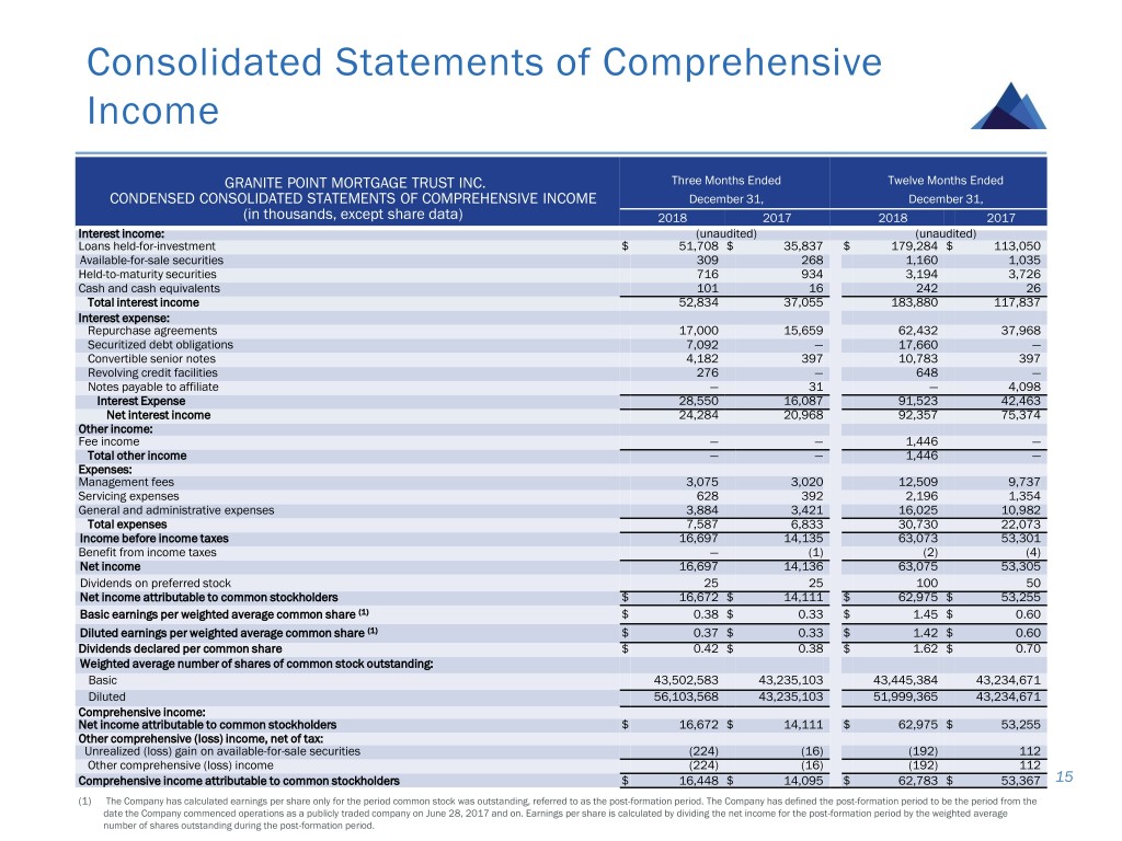 Consolidated Statements of Comprehensive Income GRANITE POINT MORTGAGE TRUST INC. Three Months Ended Twelve Months Ended CONDENSED CONSOLIDATED STATEMENTS OF COMPREHENSIVE INCOME December 31, December 31, (in thousands, except share data) 2018 2017 2018 2017 Interest income: (unaudited) (unaudited) Loans held-for-investment $ 51,708 $ 35,837 $ 179,284 $ 113,050 Available-for-sale securities 309 268 1,160 1,035 Held-to-maturity securities 716 934 3,194 3,726 Cash and cash equivalents 101 16 242 26 Total interest income 52,834 37,055 183,880 117,837 Interest expense: Repurchase agreements 17,000 15,659 62,432 37,968 Securitized debt obligations 7,092 — 17,660 — Convertible senior notes 4,182 397 10,783 397 Revolving credit facilities 276 — 648 — Notes payable to affiliate — 31 — 4,098 Interest Expense 28,550 16,087 91,523 42,463 Net interest income 24,284 20,968 92,357 75,374 Other income: Fee income — — 1,446 — Total other income — — 1,446 — Expenses: Management fees 3,075 3,020 12,509 9,737 Servicing expenses 628 392 2,196 1,354 General and administrative expenses 3,884 3,421 16,025 10,982 Total expenses 7,587 6,833 30,730 22,073 Income before income taxes 16,697 14,135 63,073 53,301 Benefit from income taxes — (1) (2) (4) Net income 16,697 14,136 63,075 53,305 Dividends on preferred stock 25 25 100 50 Net income attributable to common stockholders $ 16,672 $ 14,111 $ 62,975 $ 53,255 Basic earnings per weighted average common share (1) $ 0.38 $ 0.33 $ 1.45 $ 0.60 Diluted earnings per weighted average common share (1) $ 0.37 $ 0.33 $ 1.42 $ 0.60 Dividends declared per common share $ 0.42 $ 0.38 $ 1.62 $ 0.70 Weighted average number of shares of common stock outstanding: Basic 43,502,583 43,235,103 43,445,384 43,234,671 Diluted 56,103,568 43,235,103 51,999,365 43,234,671 Comprehensive income: Net income attributable to common stockholders $ 16,672 $ 14,111 $ 62,975 $ 53,255 Other comprehensive (loss) income, net of tax: Unrealized (loss) gain on available-for-sale securities (224) (16) (192) 112 Other comprehensive (loss) income (224) (16) (192) 112 Comprehensive income attributable to common stockholders $ 16,448 $ 14,095 $ 62,783 $ 53,367 15 (1) The Company has calculated earnings per share only for the period common stock was outstanding, referred to as the post-formation period. The Company has defined the post-formation period to be the period from the date the Company commenced operations as a publicly traded company on June 28, 2017 and on. Earnings per share is calculated by dividing the net income for the post-formation period by the weighted average number of shares outstanding during the post-formation period.