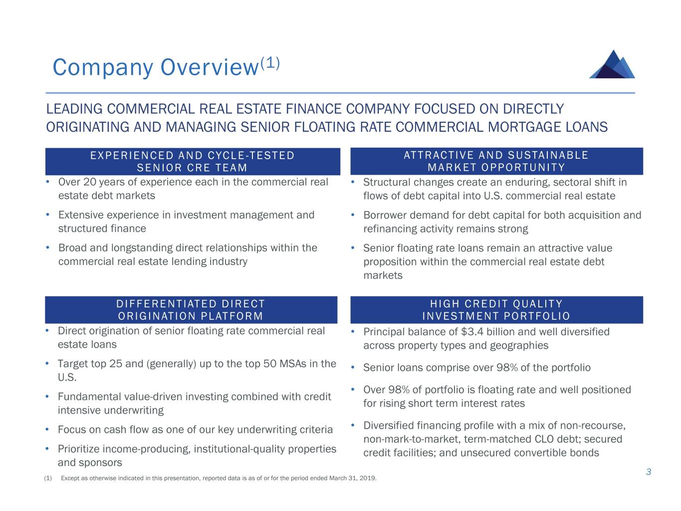 Safe Harbor Statement This presentation contains, in addition to historical information, certain forward-looking statements that are based on our current assumptions, expectations and projections about future performance and events. In particular, statements regarding future economic performance, finances, and expectations and objectives of management constitute forward-looking statements. Forward-looking statements are not historical in nature and can be identified by words such as "believes," "expects," "may," "will," "should," "seeks," "approximately," "intends," "plans," "estimates," "anticipates," “targets,” “goals,” “future,” “likely” and other expressions that are predictions of or indicate future events and trends and that do not relate to historical matters. Although the forward-looking statements contained in this presentation are based upon information available at the time the statements are made and reflect the best judgment of our senior management, forward-looking statements inherently involve known and unknown risks, uncertainties and other factors, which may cause the actual results, performance or achievements to differ materially from anticipated future results. Important factors that could cause actual results to differ materially from expected results, including, among other things, those described in our filings with the Securities and Exchange Commission (“SEC”), including our annual report on form 10-K for the year ended December 31, 2018, and any subsequent Quarterly Reports on Form 10-Q under the caption “Risk Factors.” Factors that could cause actual results to differ include, but are not limited to: the state of the U.S. economy generally or in specific geographic regions; the general political, economic, and competitive conditions in the markets in which we invest; defaults by borrowers in paying debt service on outstanding indebtedness and borrowers' abilities to manage and stabilize properties; our ability to obtain financing arrangements on terms favorable to us or at all; the level and volatility of prevailing interest rates and credit spreads; reductions in the yield on our investments and an increase in the cost of our financing; general volatility of the securities markets in which we participate; the return or impact of current or future investments; allocation of investment opportunities to us by our Manager; increased competition from entities investing in our target assets; effects of hedging instruments on our target investments; changes in governmental regulations, tax law and rates, and similar matters; our ability to maintain our qualification as a REIT for U.S. federal income tax purposes and our exclusion from registration under the Investment Company Act; availability of desirable investment opportunities; availability of qualified personnel and our relationship with our Manager; estimates relating to our ability to make distributions to our stockholders in the future; hurricanes, earthquakes, and other natural disasters, acts of war and/or terrorism and other events that may cause unanticipated and uninsured performance declines and/or losses to us or the owners and operators of the real estate securing our investments; deterioration in the performance of the properties securing our investments that may cause deterioration in the performance of our investments and, potentially, principal losses to us; and difficulty or delays in redeploying the proceeds from repayments of our existing investments. These forward-looking statements apply only as of the date of this press release. We are under no duty to update any of these forward-looking statements after the date of this presentation to conform these statements to actual results or revised expectations. You should, therefore, not rely on these forward-looking statements as predictions of future events. This presentation also contains estimates and other statistical data made by independent parties and by us relating to market size and growth and other data about our industry. This data involves a number of assumptions and limitations, and you are cautioned not to give undue weight to such estimates. In addition, projections, assumptions and estimates of our future performance and the future performance of the markets in which we operate are necessarily subject to a high degree of uncertainty and risk. 2