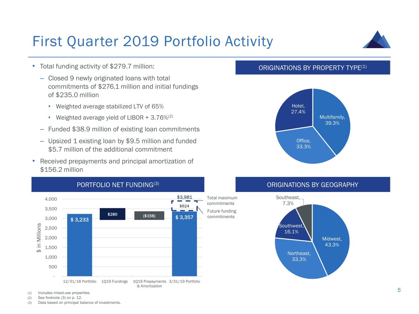 Investment Portfolio Detail(1) Maximum All-in Original Origination Loan Principal Carrying Cash Yield at Maturity Property Stabilized ($ in millions) Type Date Commitment Balance Value Coupon(2) Origination(3) (Years) State Type Initial LTV(5) LTV(6) Asset 1 Senior 07/18 144.3 113.7 112.6 L + 3.34% L + 4.27% 2.0 CA Retail 50.7% 55.9% Asset 2 Senior 09/17 125.0 108.1 107.4 L + 4.45% L + 5.03% 3.0 CT Office 62.9% 58.9% Asset 3 Senior 07/16 120.4 109.1 108.6 L + 4.45% L + 4.99% 4.0 Various Office 62.8% 61.5% Asset 4 Senior 12/15 120.0 120.0 119.9 L + 3.65% L + 4.43% 4.0 LA Mixed-Use 65.5% 60.0% Asset 5 Senior 12/18 92.0 30.7 29.7 L+3.75% L+5.21% 3.0 NY Mixed-Use 26.2% 47.6% Asset 6 Senior 05/17 86.8 79.1 78.5 L + 3.50% L + 4.82% 4.0 MA Office 71.3% 71.5% Asset 7 Senior 11/16 82.3 60.6 60.4 L + 3.25% L + 5.78% 3.0 OR Office 66.5% 51.1% Asset 8 Senior 10/17 74.8 44.7 44.3 L + 4.07% L + 4.47% 4.0 DC Office 67.0% 66.0% Asset 9 Senior 11/17 73.3 68.8 68.3 L + 4.45% L + 5.20% 3.0 TX Hotel 68.2% 61.6% Asset 10 Senior 12/16 71.7 68.0 67.0 L + 3.75% L + 4.87% 4.0 FL Office 73.3% 63.2% Asset 11 Senior 06/16 68.3 60.6 60.4 L + 3.87% L + 4.93% 4.0 HI Retail 76.2% 57.4% Asset 12 Senior 11/17 68.3 61.2 60.8 L + 4.10% L + 4.73% 3.0 CA Office 66.8% 67.0% Asset 13 Senior 08/16 65.0 63.7 63.3 L + 3.95% L + 5.54% 4.0 NJ Office 60.8% 63.0% Asset 14 Senior 01/19 64.5 64.5 63.8 L + 3.85% L + 4.38% 3.0 MN Hotel 67.2% 64.5% Asset 15 Senior 04/18 64.0 64.0 63.5 L + 3.78% L + 4.23% 3.0 GA Hotel 68.8% 59.8% Assets 16-100 Various Various 2,660.2 2,239.8 2,223.1 L + 4.01% L + 4.65% 3.2 Various Various 67.8% 64.6% Total/Weighted Average $3,980.9 $3,356.6 $3,331.6 L + 3.97% L + 4.71%(4) 3.3 66.6% 63.4% (1) As of March 31, 2019. (2) Cash coupon does not include origination or exit fees. (3) Provided for illustrative purposes only. Calculations of all-in yield at origination are based on a number of assumptions (some or all of which may not occur) and are expressed as monthly equivalent yields that include net origination fees and exit fees and exclude future fundings and any potential or completed loan amendments or modifications. (4) Calculations of all-in weighted average yield at origination exclude fixed rate loans. (5) Initial LTV is calculated as the initial loan amount (plus any financing that is pari passu with or senior to such loan) divided by the as is appraised value (as determined in conformance with USPAP) as of the 12 date the loan was originated set forth in the original appraisal. (6) Stabilized loan-to-value ratio (LTV) is calculated as the fully funded loan amount (plus any financing that is pari passu with or senior to such loan), including all contractually provided for future fundings, divided by the as stabilized value (as determined in conformance with USPAP) set forth in the original appraisal. As stabilized value may be based on certain assumptions, such as future construction completion, projected re-tenanting, payment of tenant improvement or leasing commissions allowances or free or abated rent periods, or increased tenant occupancies.